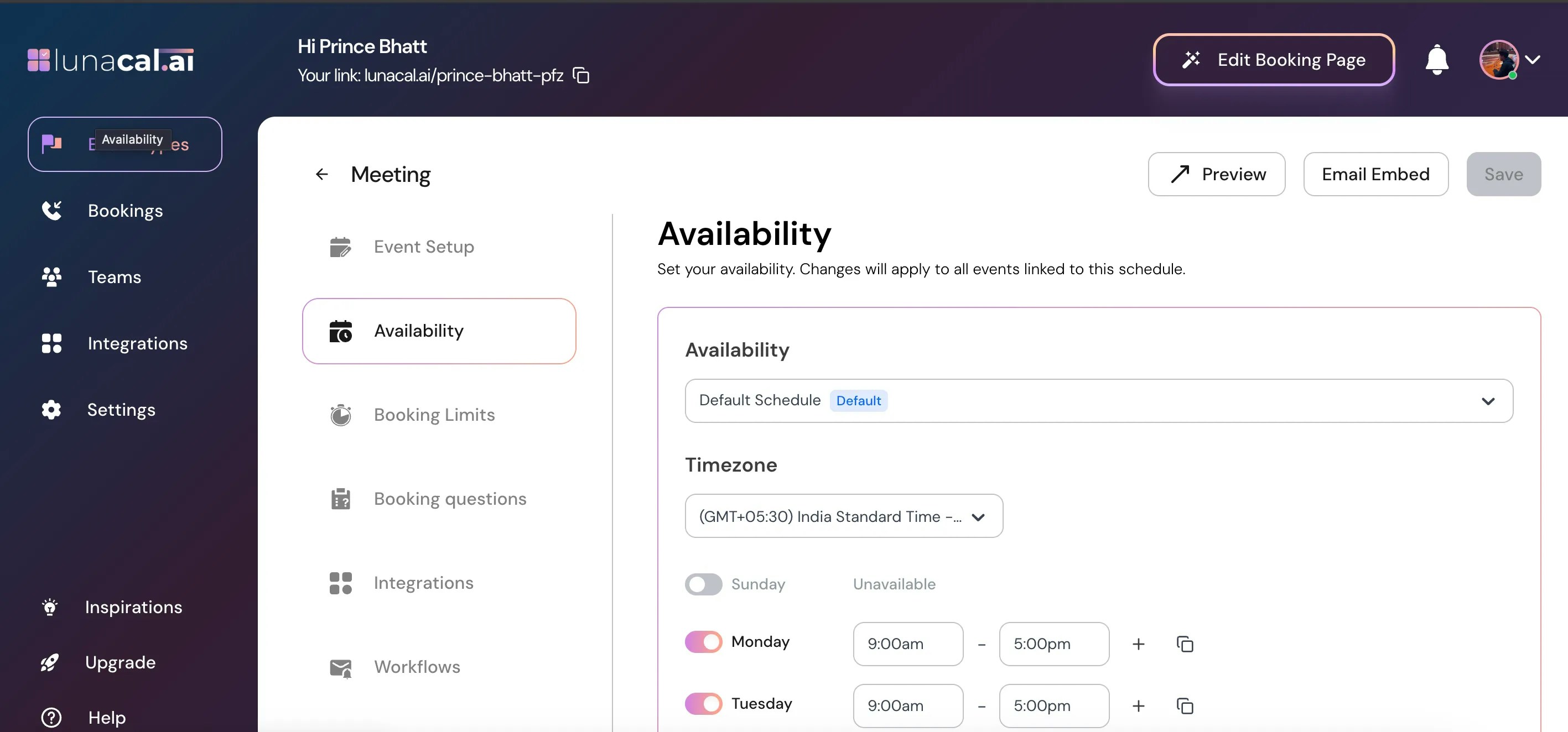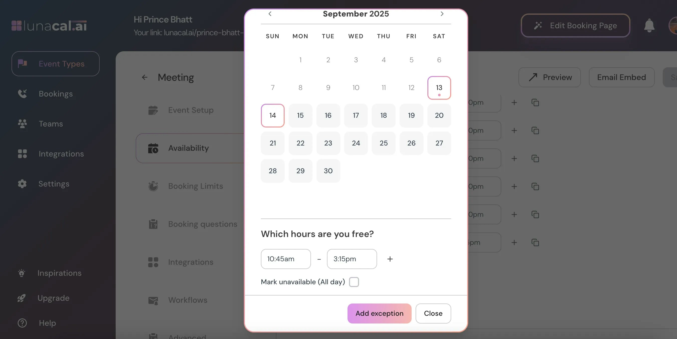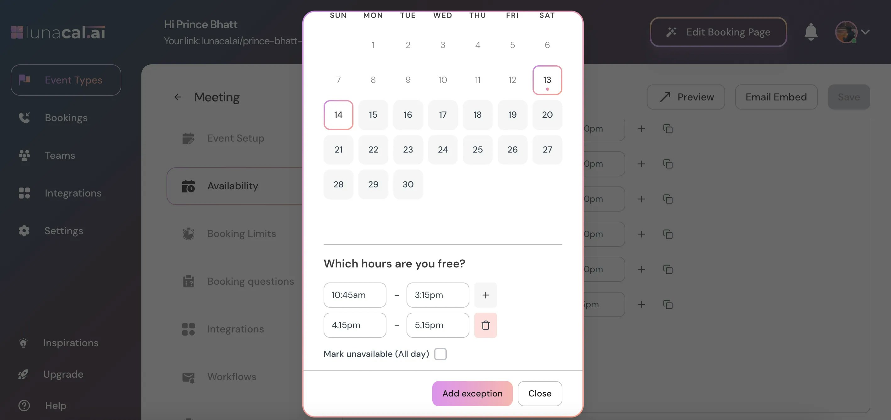 Click the ”+” button to add multiple time ranges if you’re available at different slots during the same day.