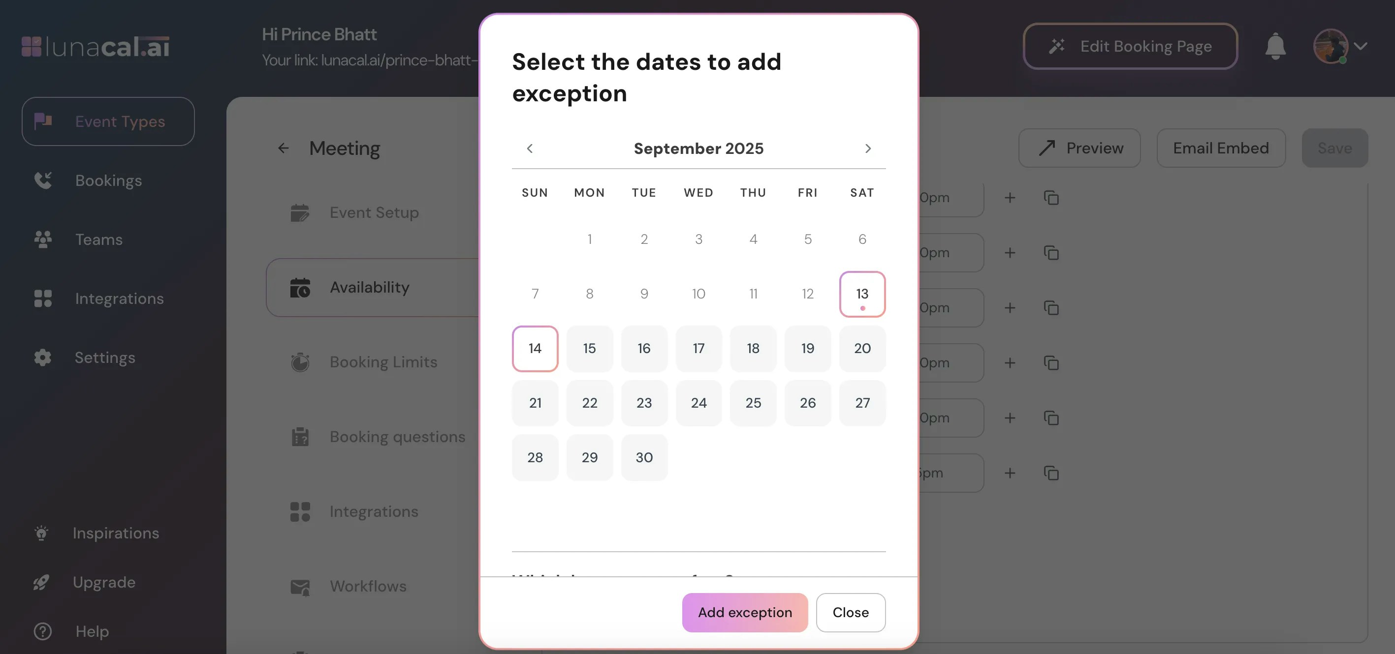 Select the event for which you want to set an availability exception and click on the “Settings” icon on that event card.