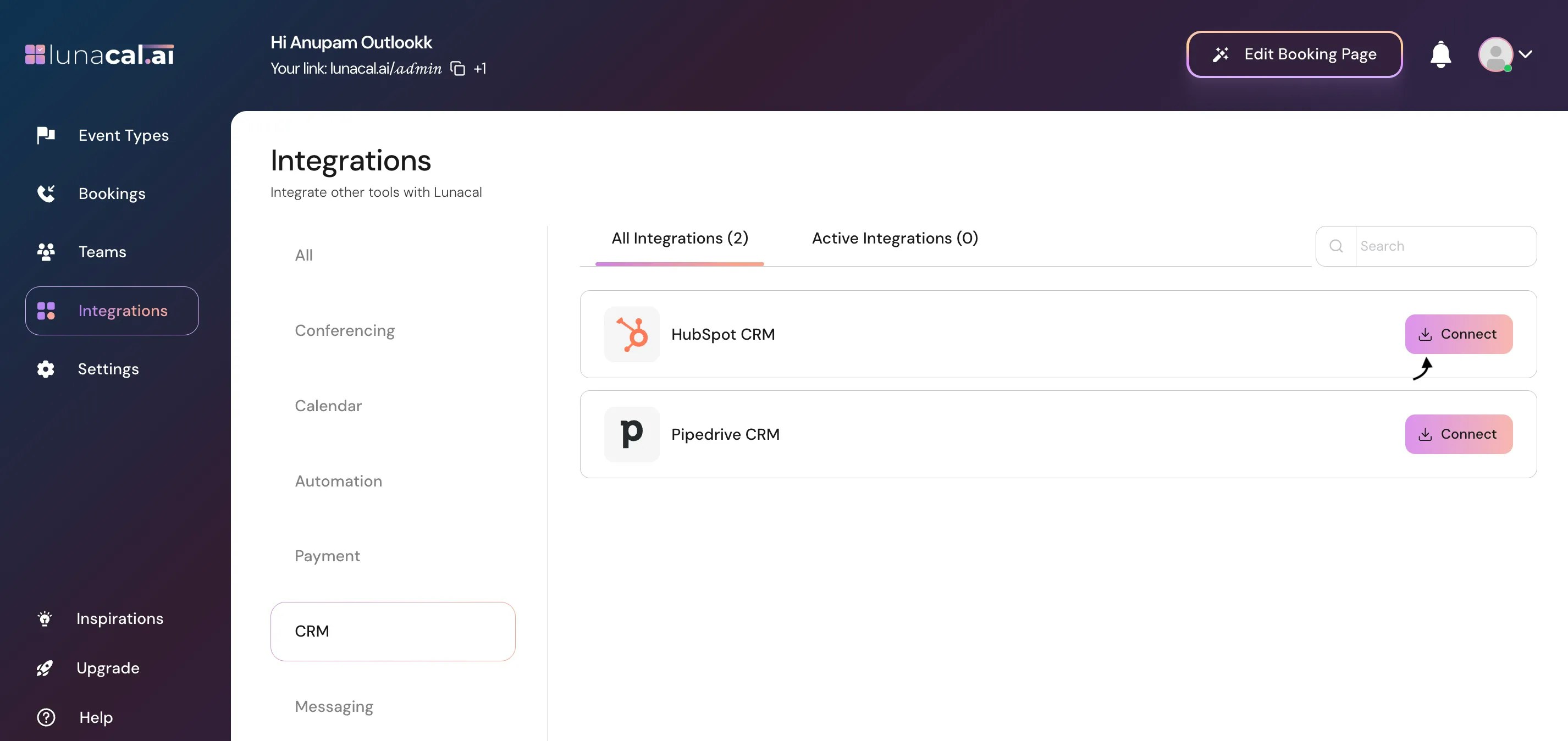 - Open Integrations > CRM in Lunacal