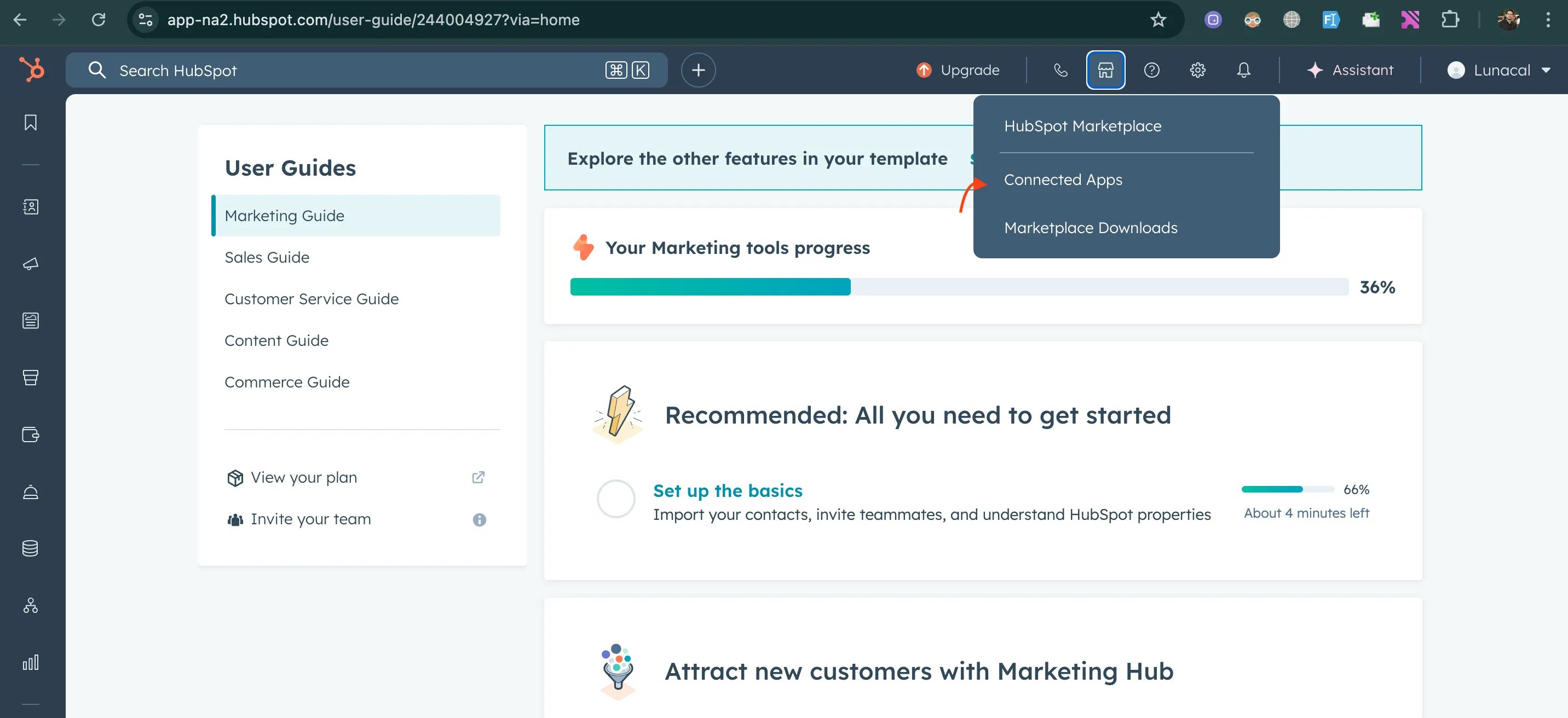 - In HubSpot, Hover the Marketplace (main nav) Icon.