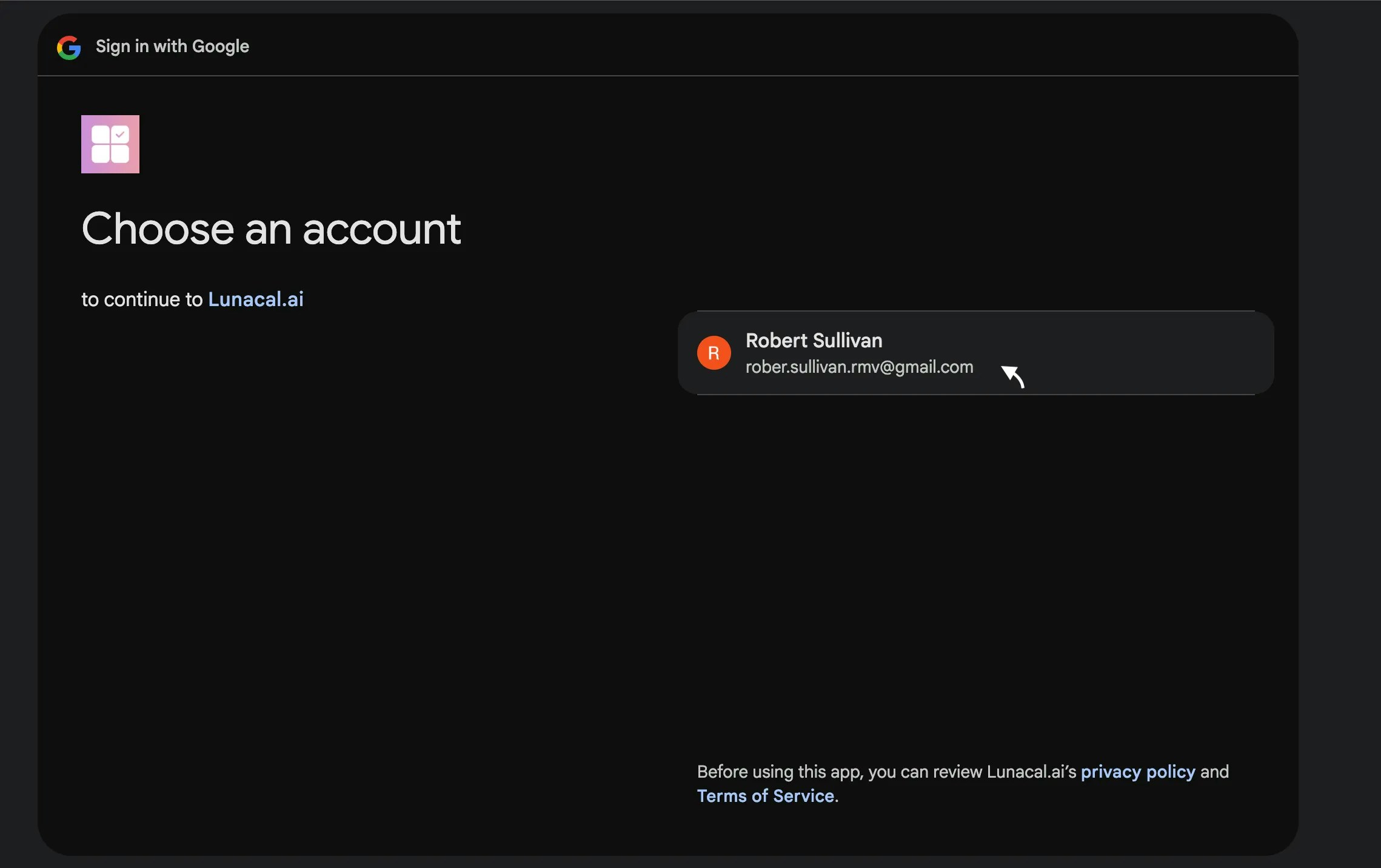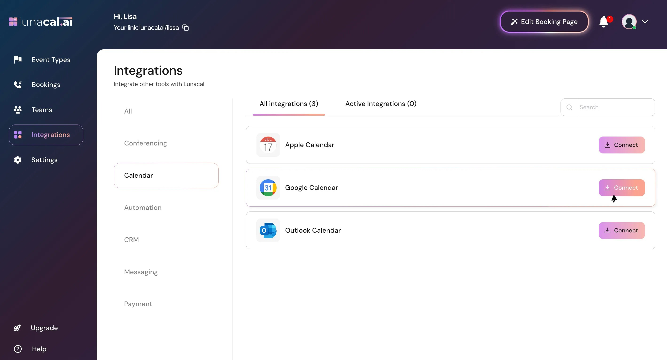 Choose the calendar you want and click “connect” (e.g., Google Calendar).Example: You primarily use Google Calendar for work—pick Google and continue