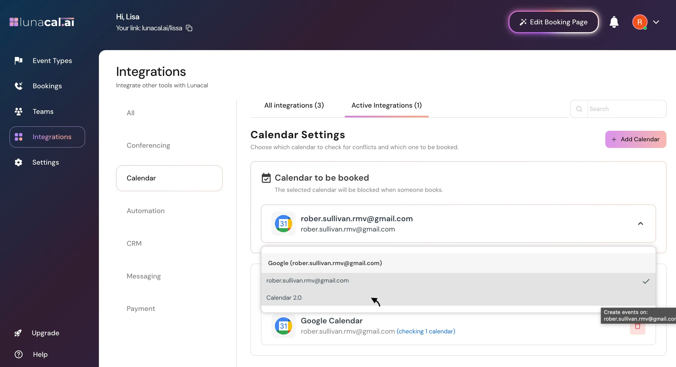 Your calendar is now connected. If you have multiple calendars, pick where new events should be added. For example, switch the target to your “Calendar 2.0” if that’s your main booking calendar.Example: Keep personal events on “Personal” but set bookings to land on “Team Bookings” so your team sees them.