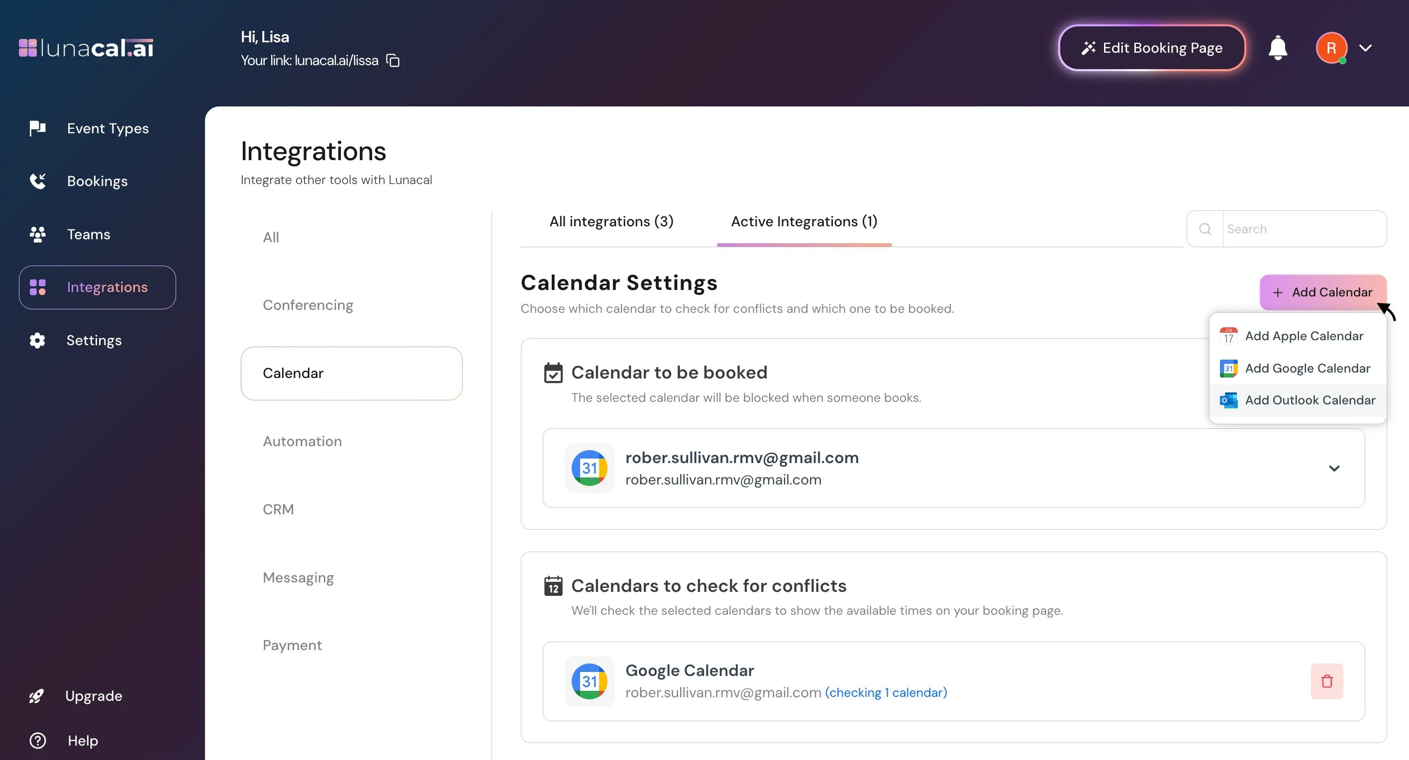Add more calendars if needed. You can connect another Google Calendar or install new calendar apps like Apple Calendar or Outlook Calendar.Example: Connect Outlook Calendar from your employer and Google Calendar from your freelance work to prevent double-booking across both..