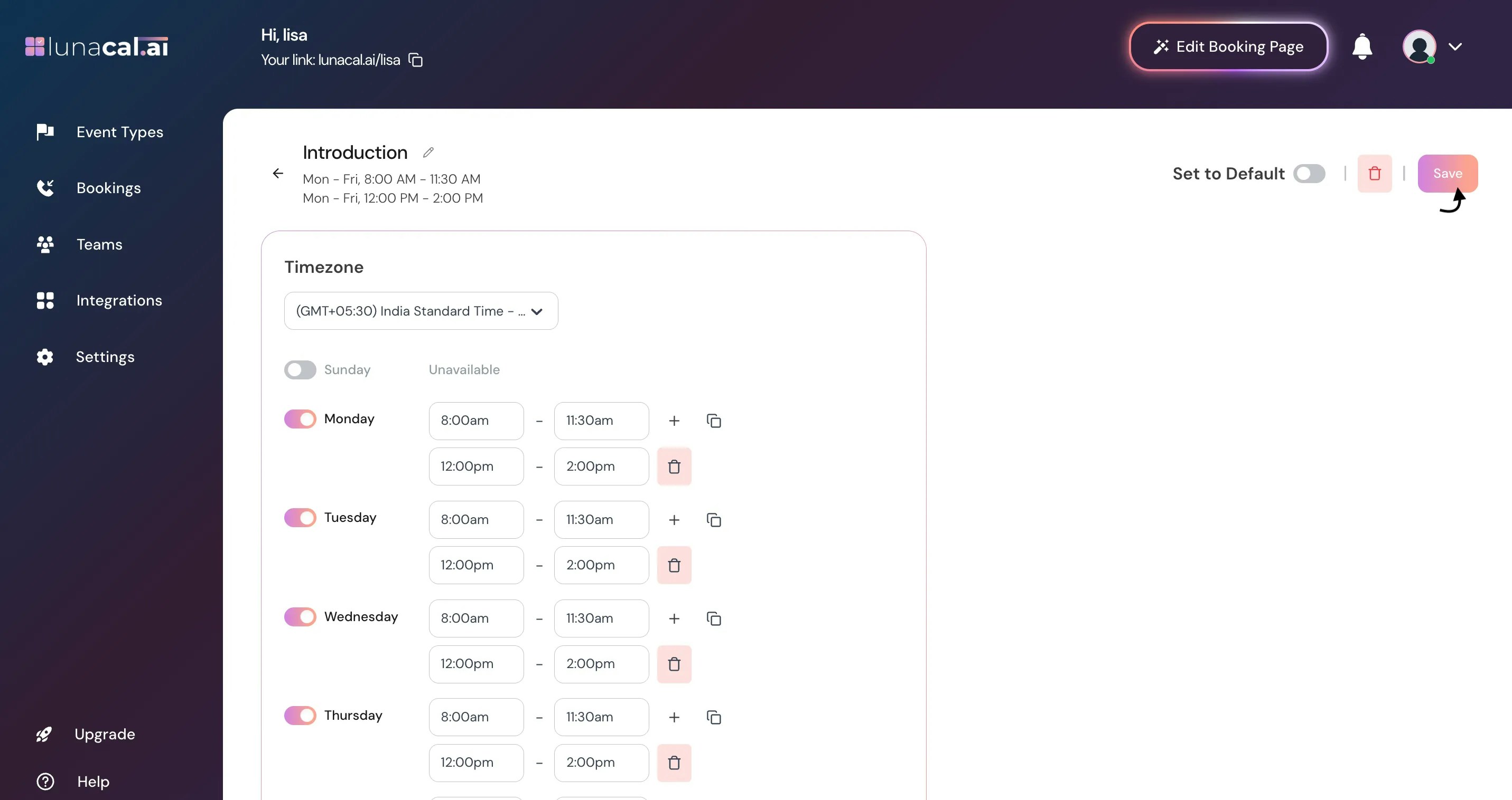 Adjust your default working hours (for example, 9:00 AM–5:00 PM) and turn specific days on or off.Any day you disable won’t appear on your booking page.