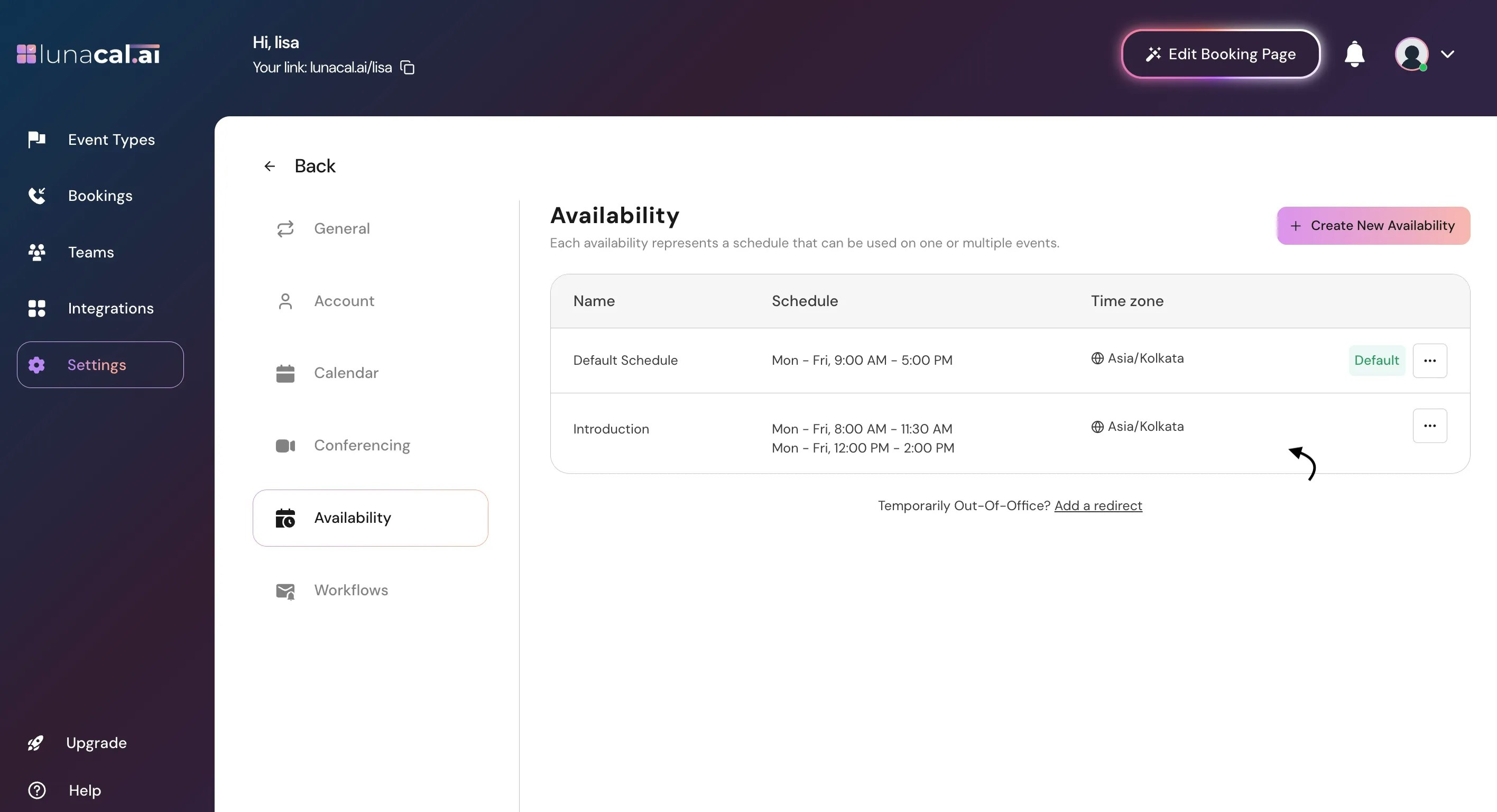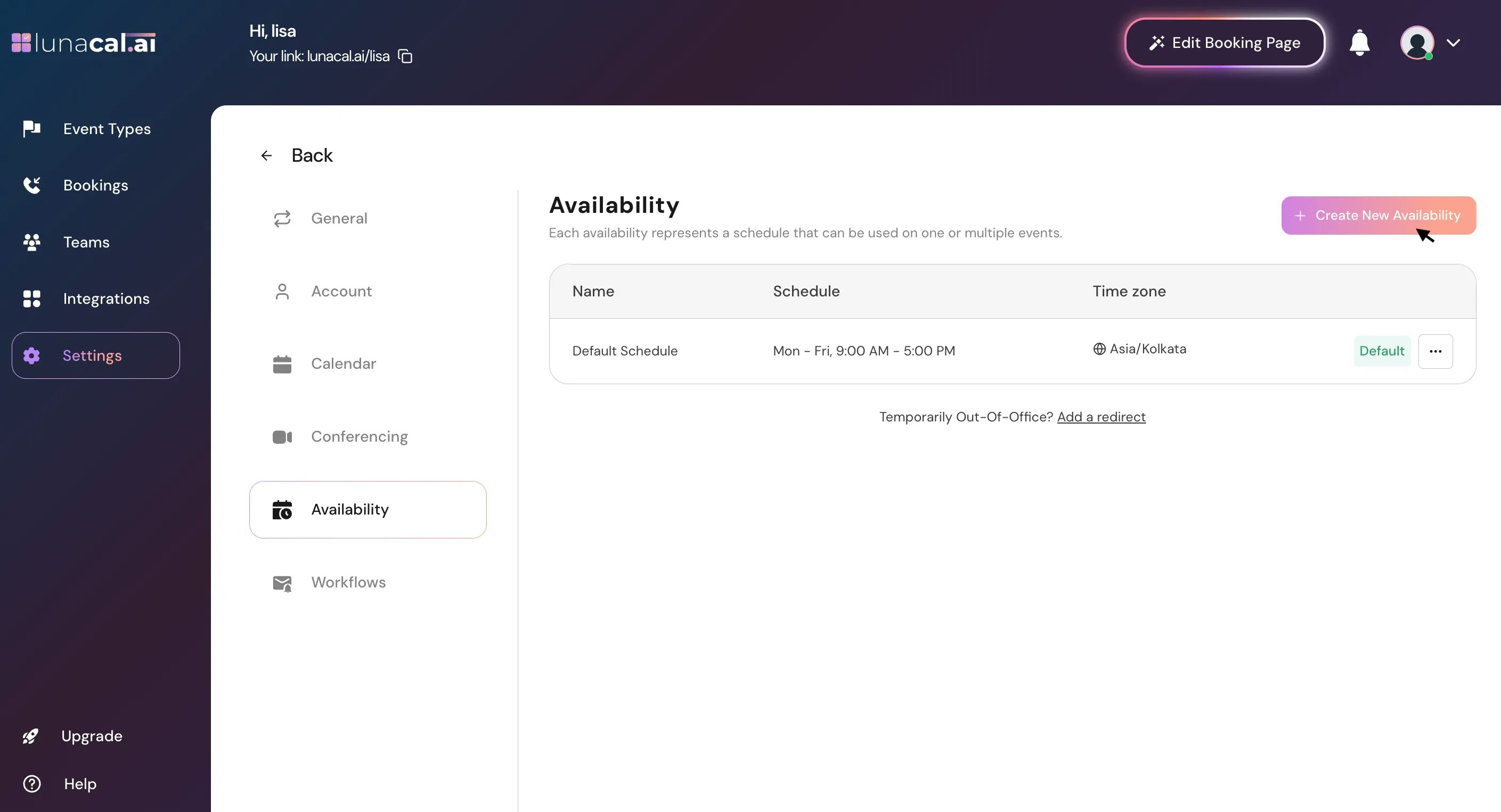 You’ll see a default schedule. Click “Create New Availability”.