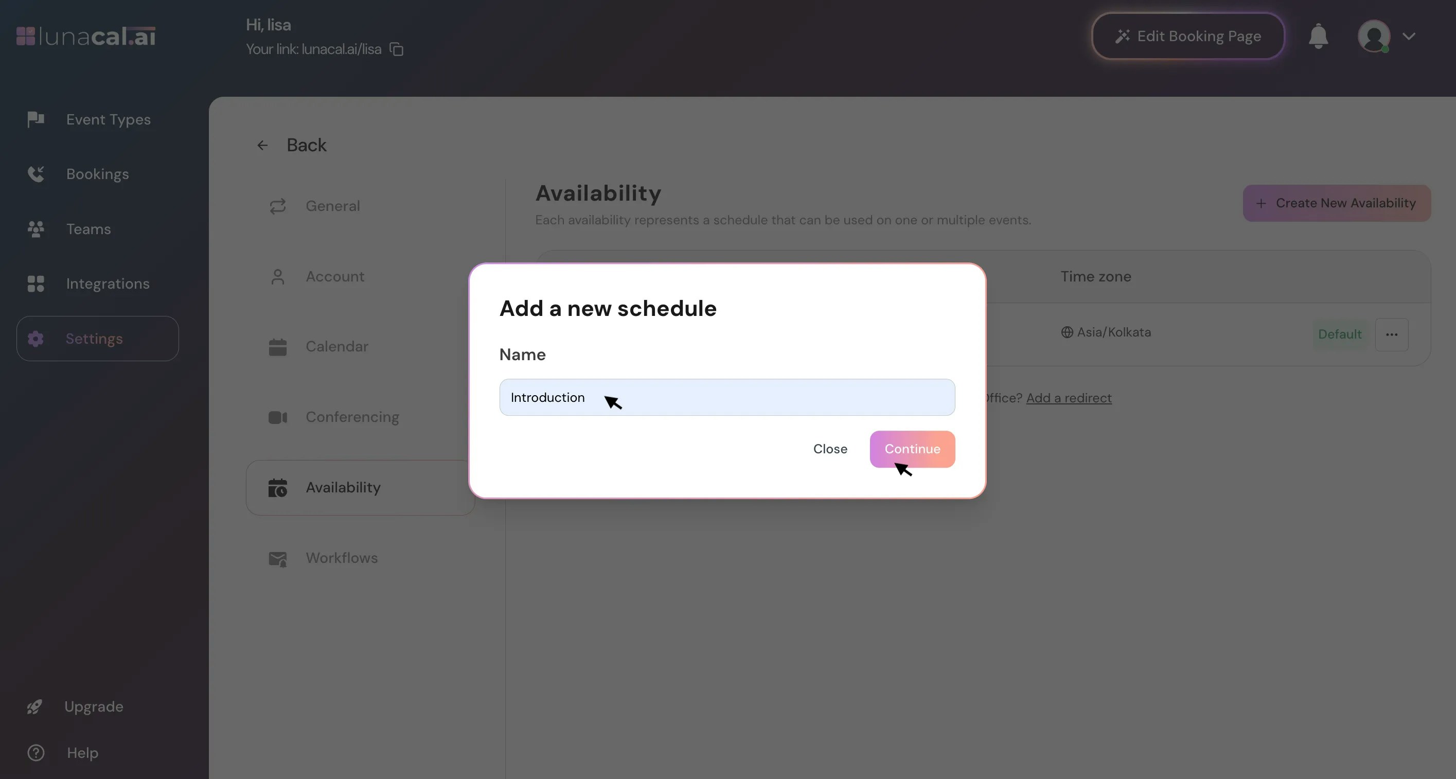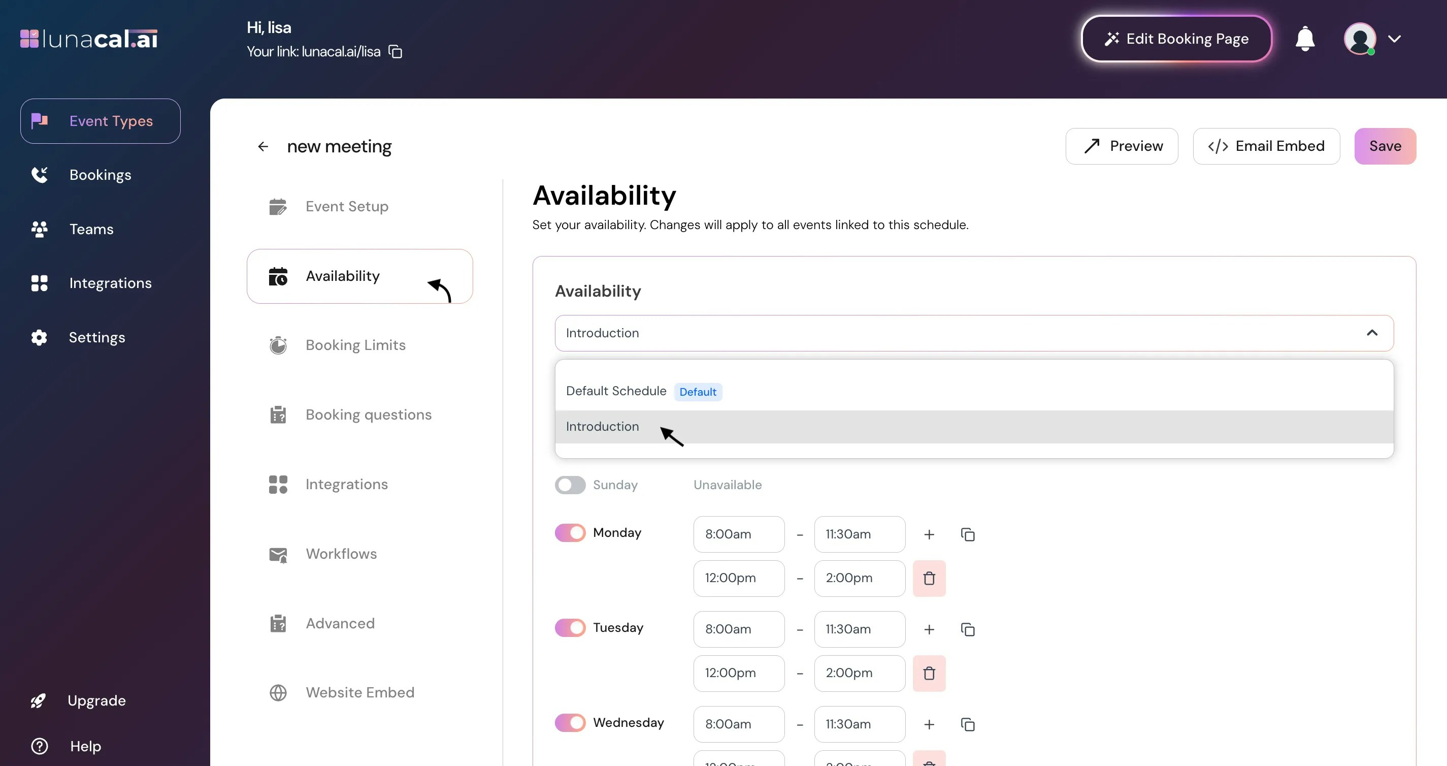 Use the dropdown to select one of your saved availabilities — for example, “Introduction.”The selected availability will apply to the specific event type you’re configuring, so that event will follow the same working hours and rules.