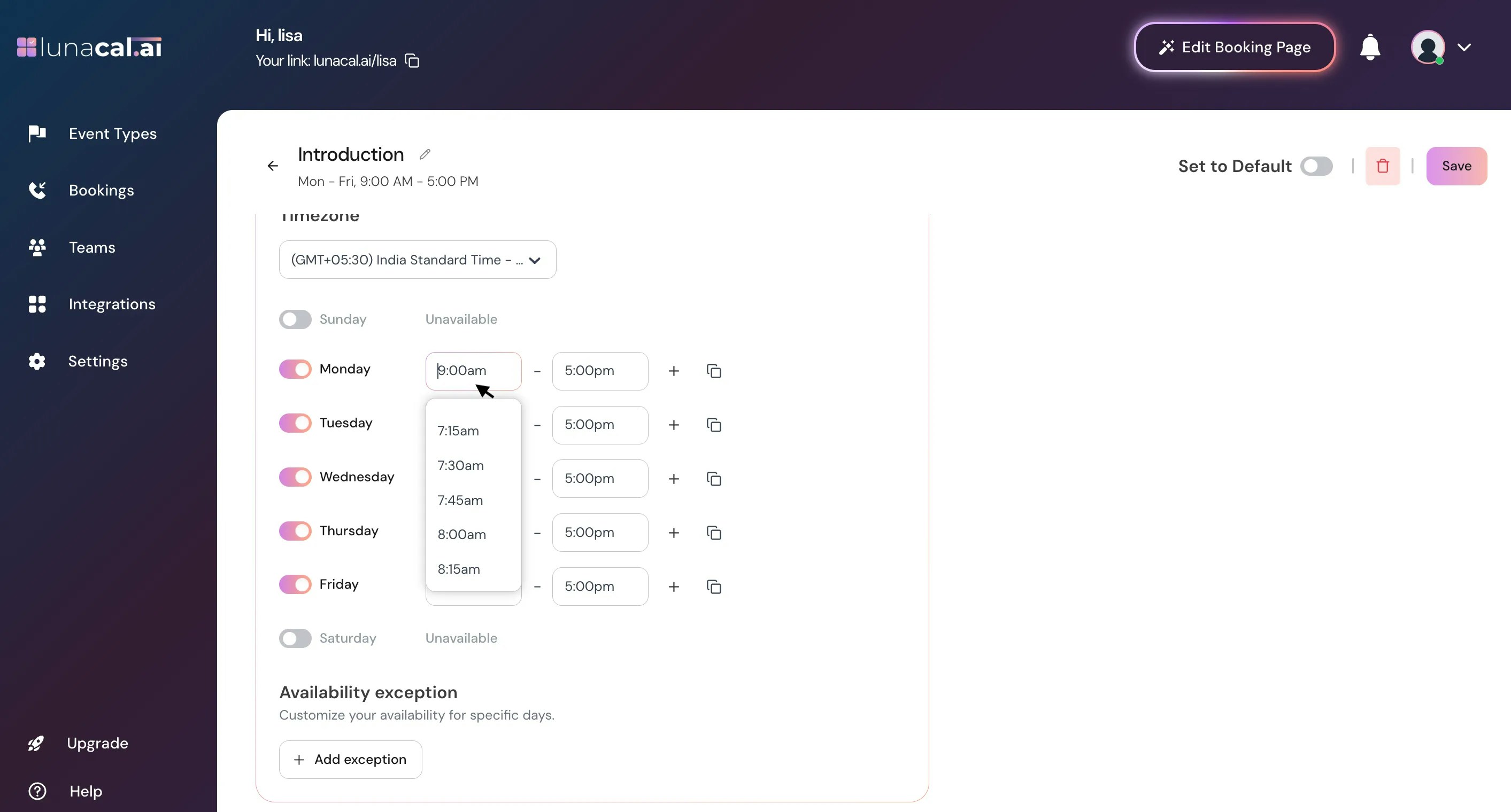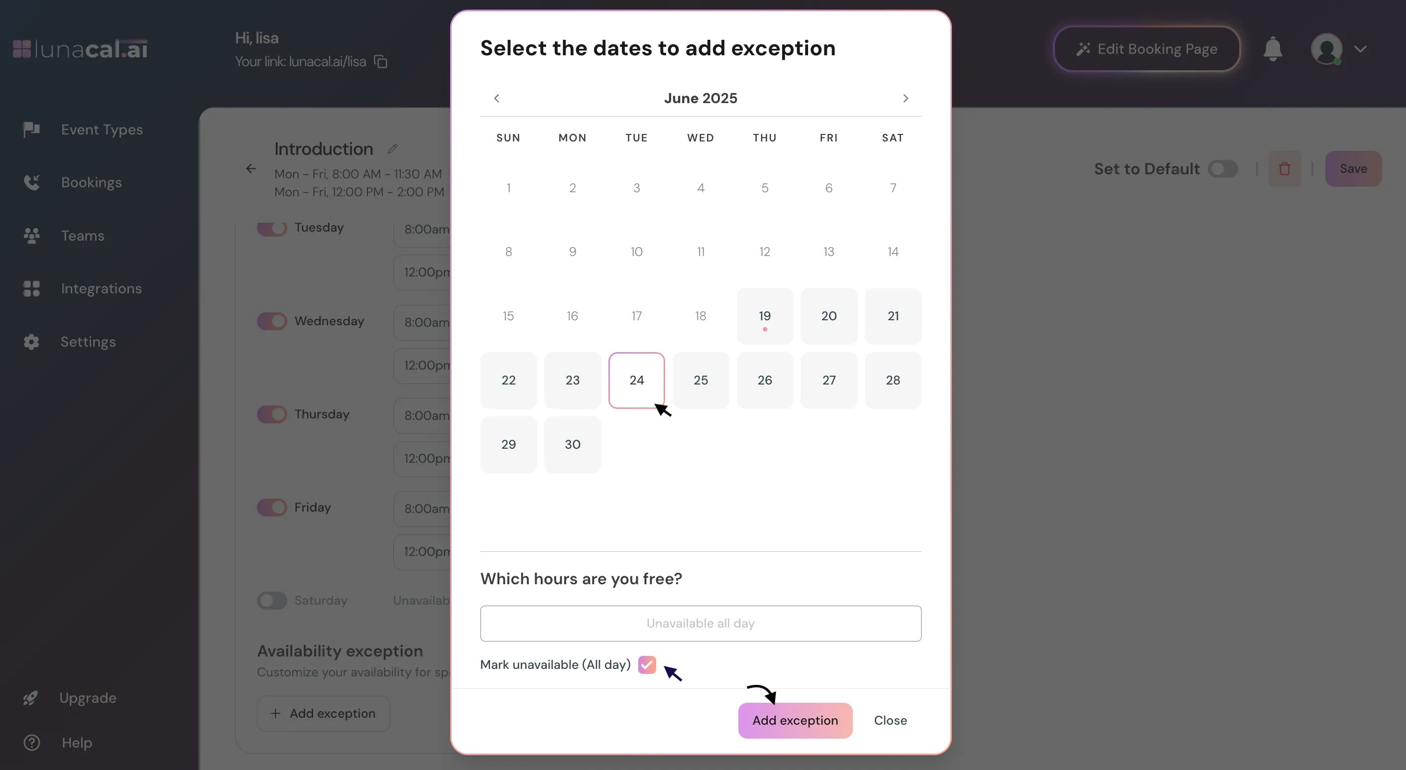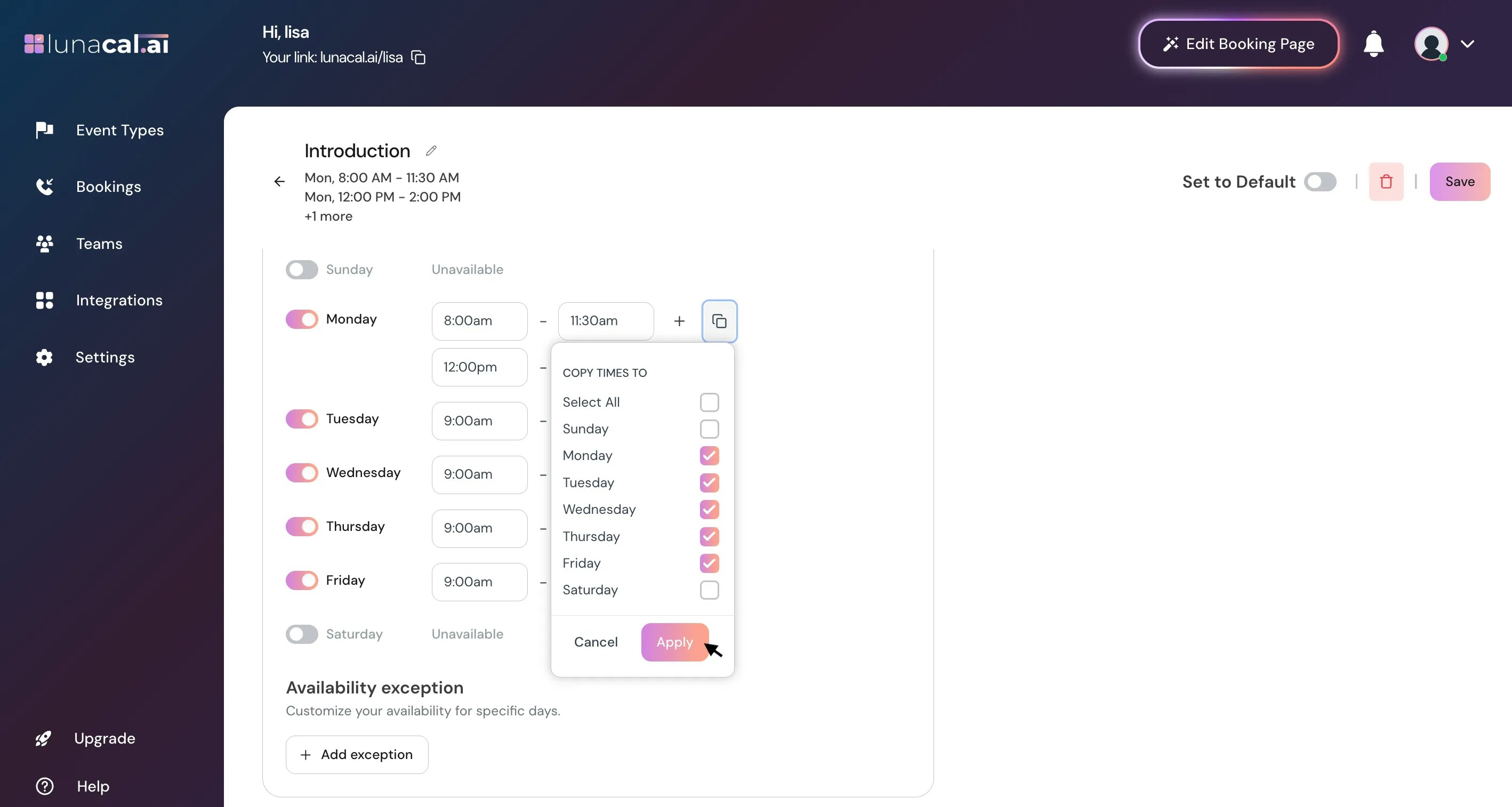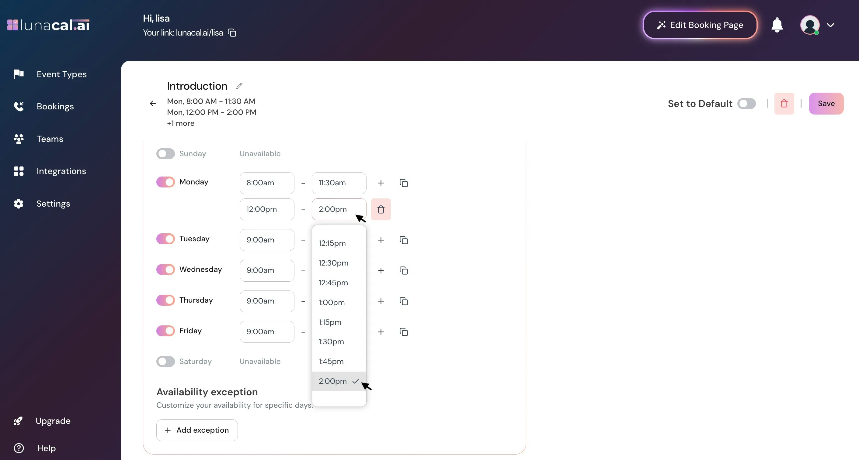 Availability Exception : This lets you block specific dates or times when you’re unavailable, even if those fall within your regular working hours. It’s useful for holidays, breaks, or one-off days off. To add an exception, click Add Exception.