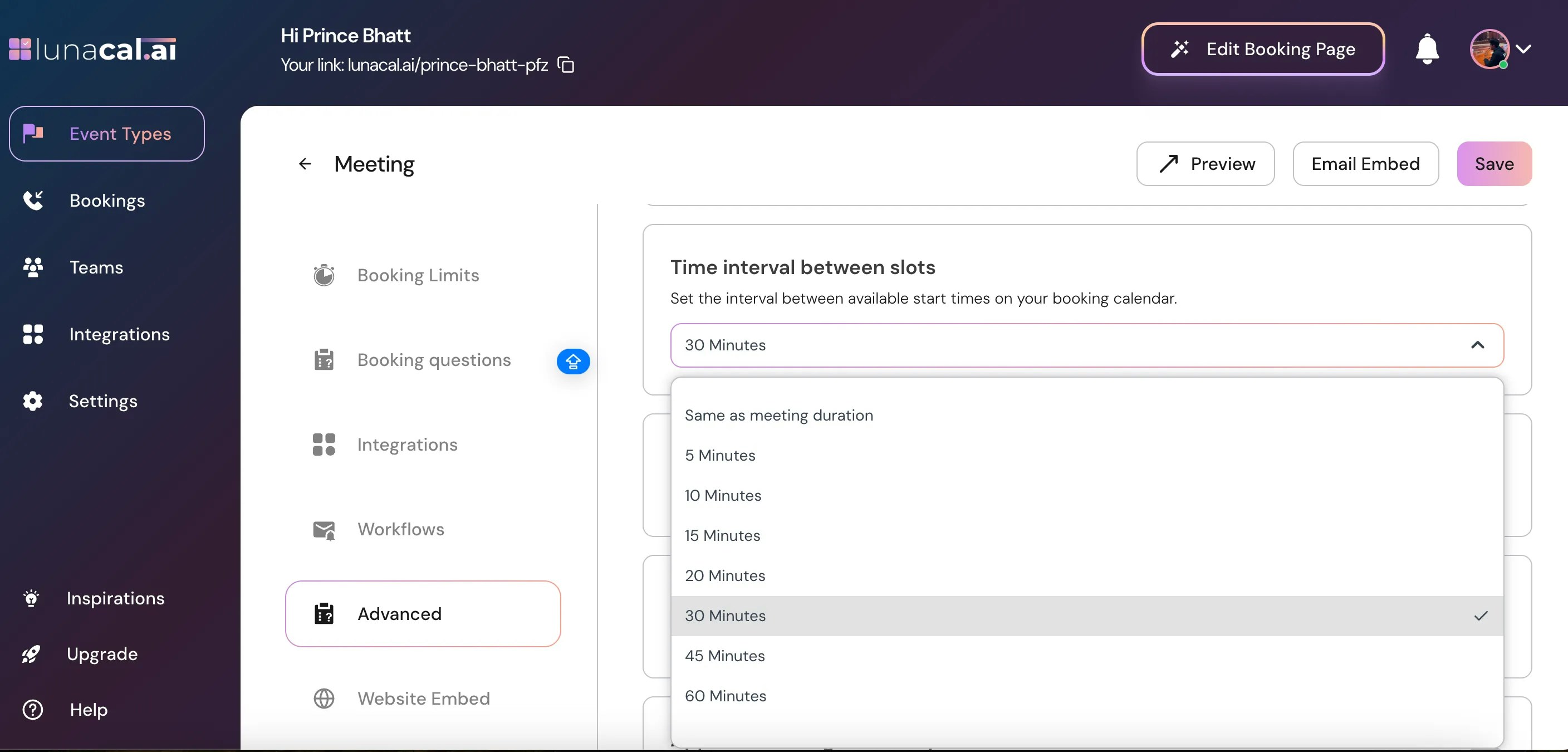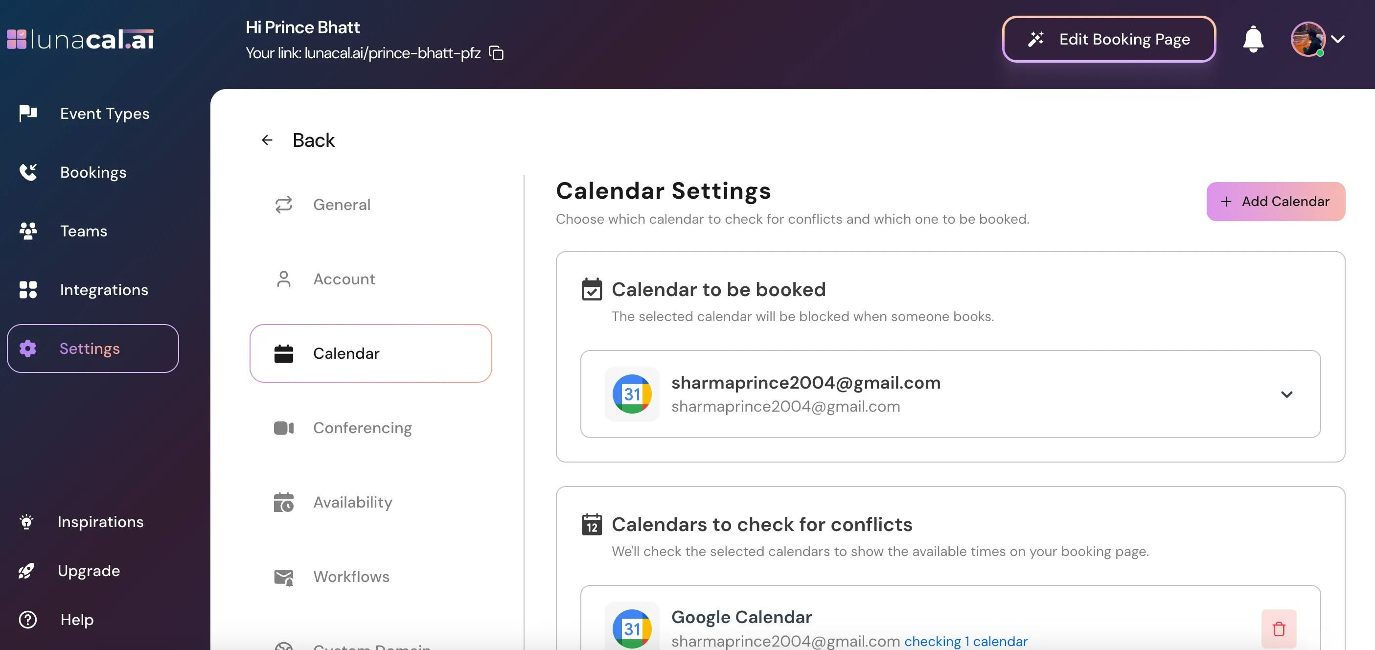 ”Calendar Conflicts” - If one of your connected calendars already has a booking at that time, Lunacal will automatically block that slot to avoid double-booking.