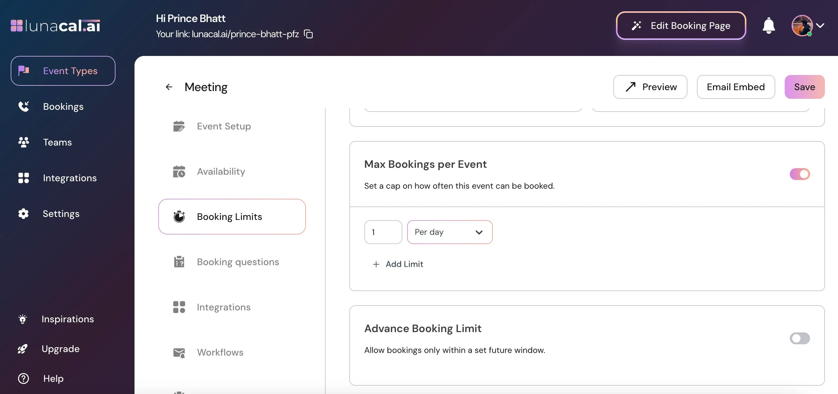 ”Booking Limits” - Check if you’ve set any daily, weekly, or per-event booking limits. These limits can restrict availability even if your calendar is technically open.
