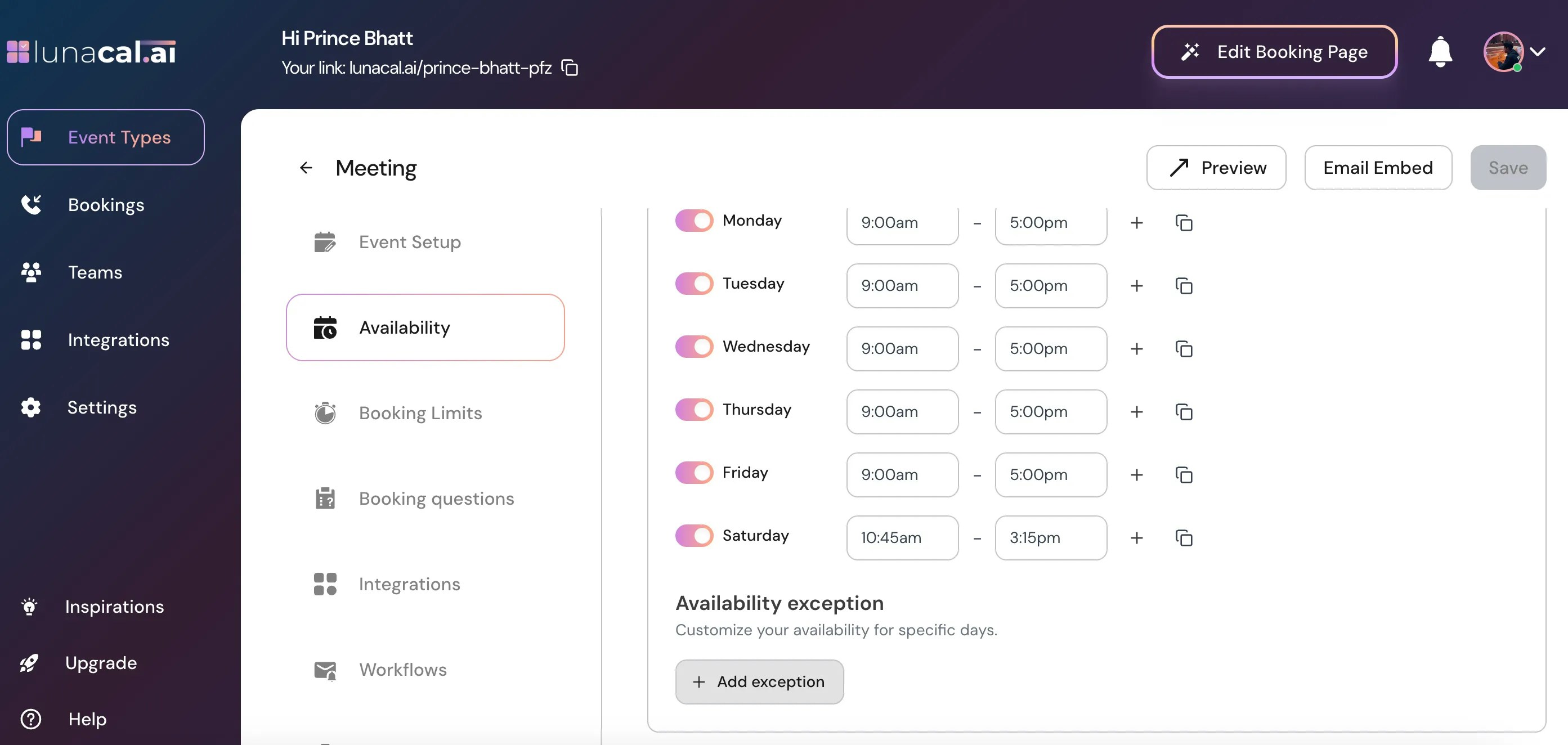 ”Availability & Exceptions”- Make sure your weekly availability is set correctly and that no exceptions (like holidays or custom rules) are blocking your time.