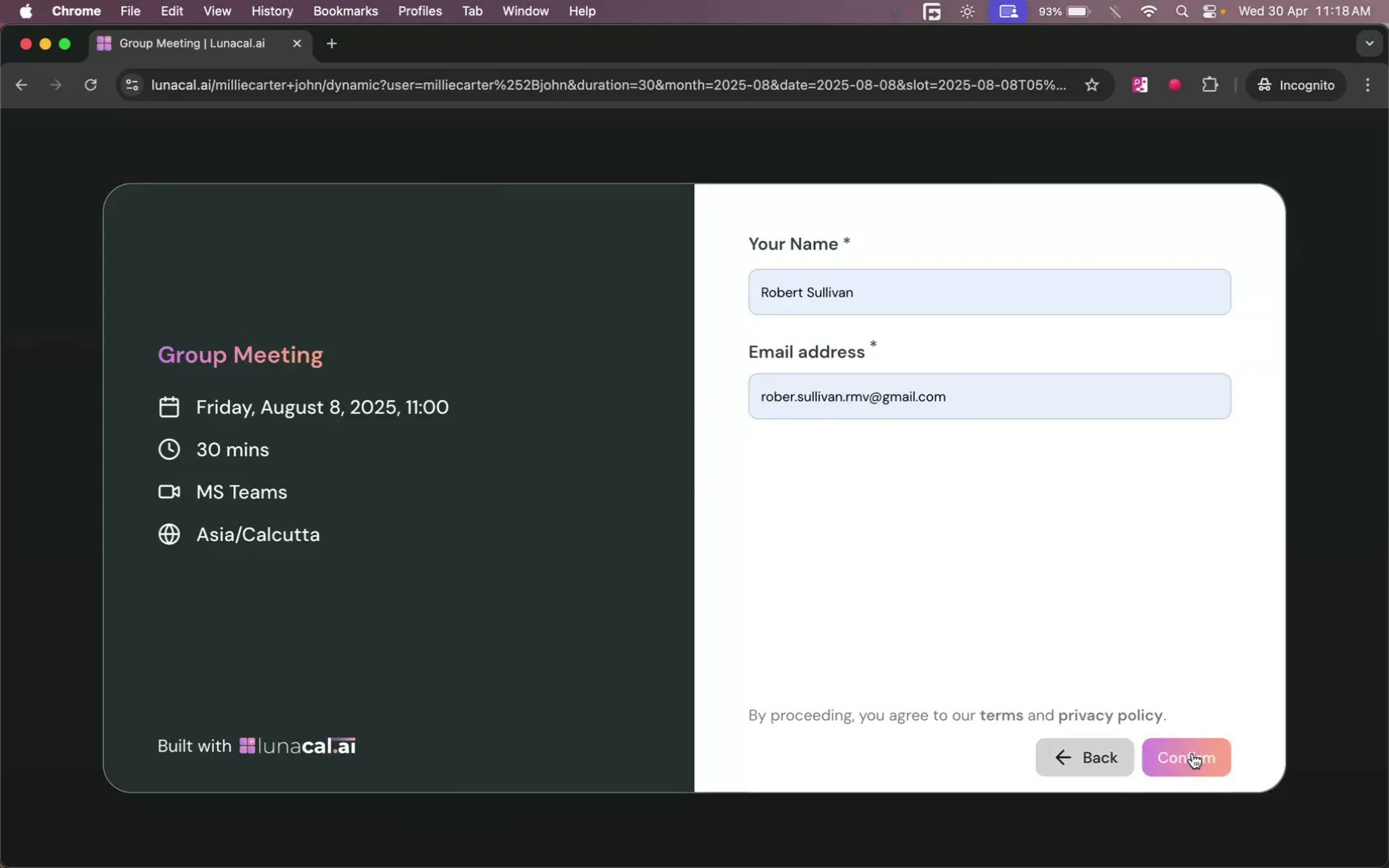 Pick a time (e.g., 8 August, 11:00). Enter your name in the field. Example: If you’re booking for a client, type the client’s name here so the event shows the right attendee.