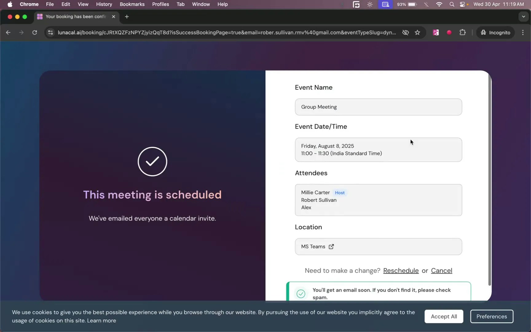 You’ll see a confirmation screen—your booking is complete. Example: Need to align three teammates and an external partner? Add only your two teammates’ usernames; share the confirmed time with the partner afterward.