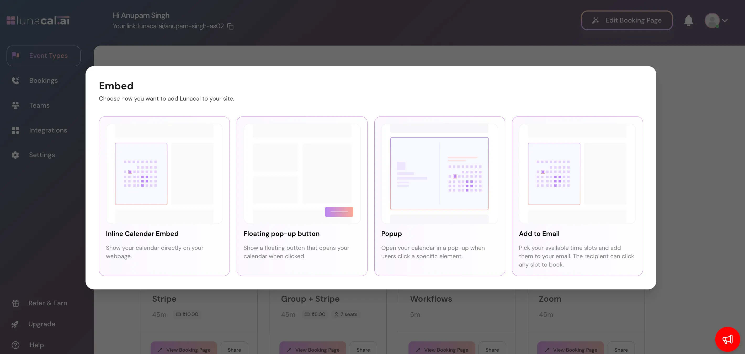Navigate to event types (e.g., a 30-minute meeting). Click the settings button, then choose “Embed”.