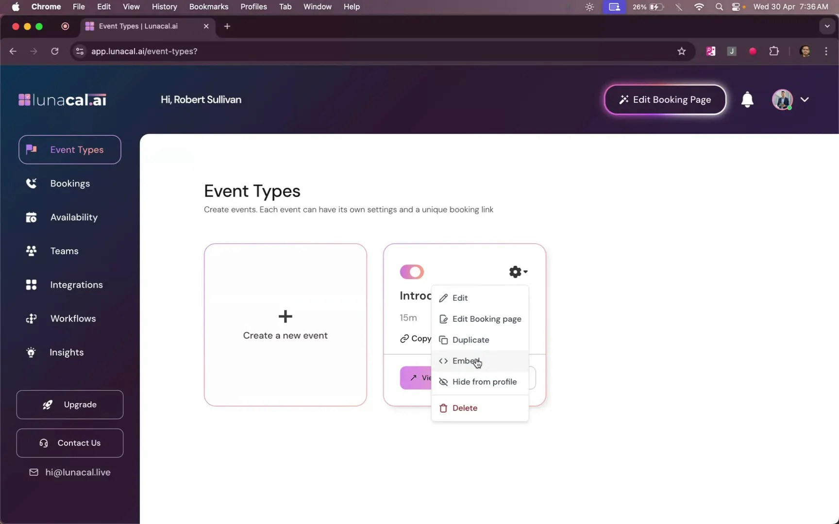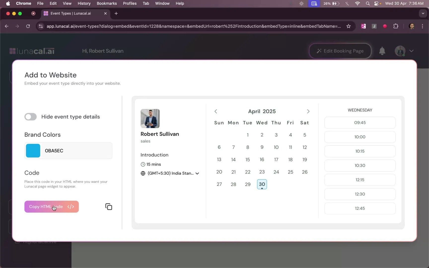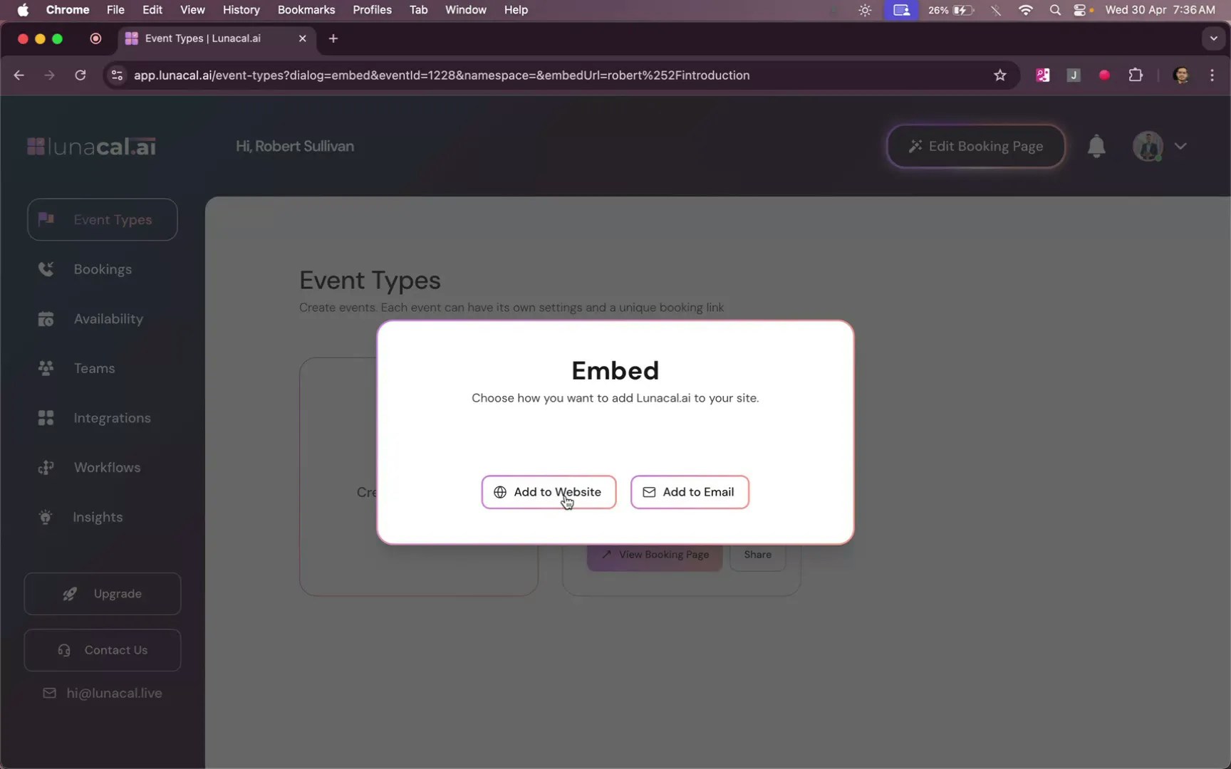 Use “Embed Event Into Your Website” to place your booking flow directly on your site so visitors can book without leaving. You’ll use the “Embed” section to generate and copy a small HTML snippet.