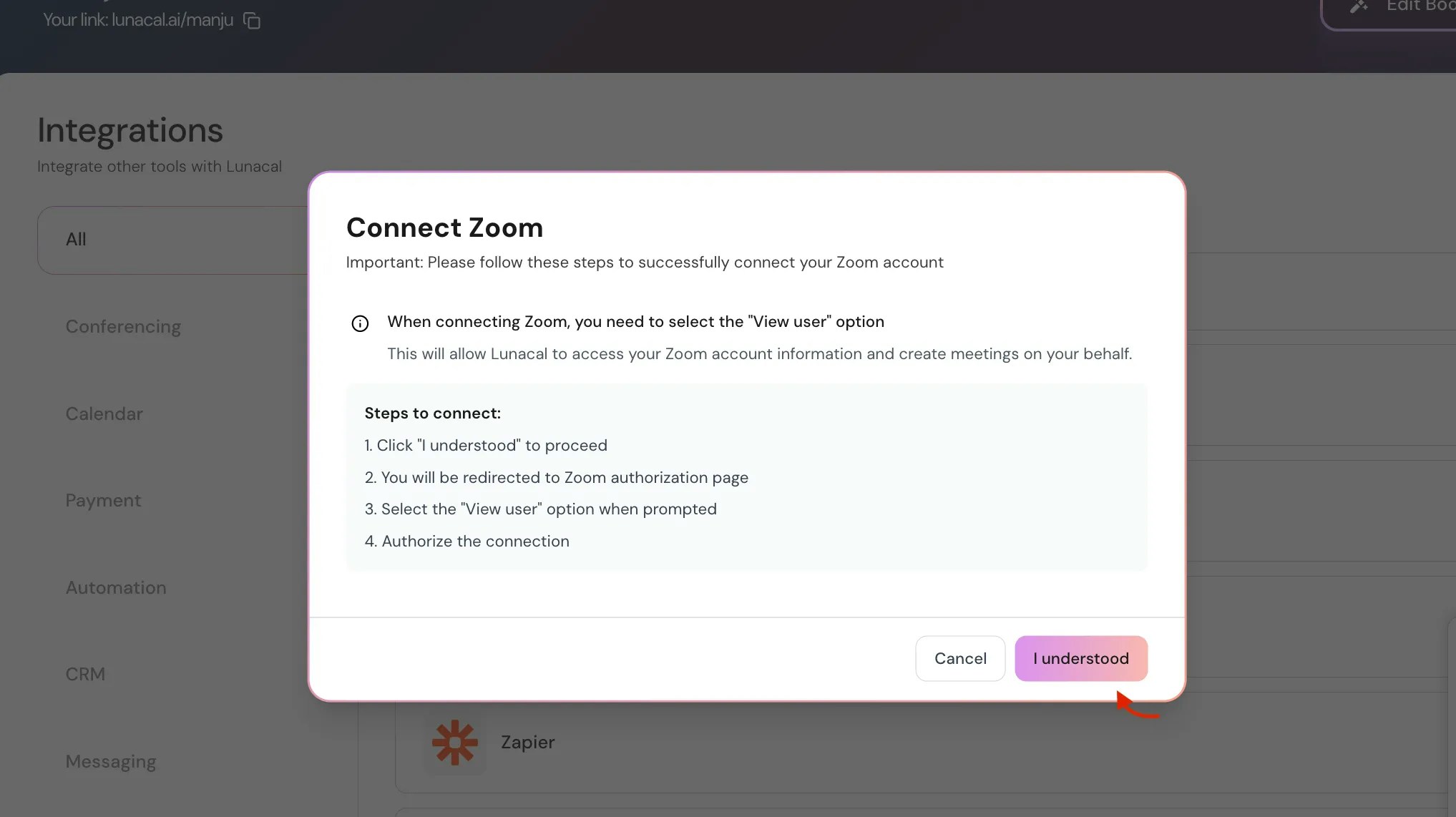 Important: When connecting Zoom, make sure to select the “View user” optionThis permission allows Lunacal to access your Zoom profile and automatically create Zoom meetings for your bookings.