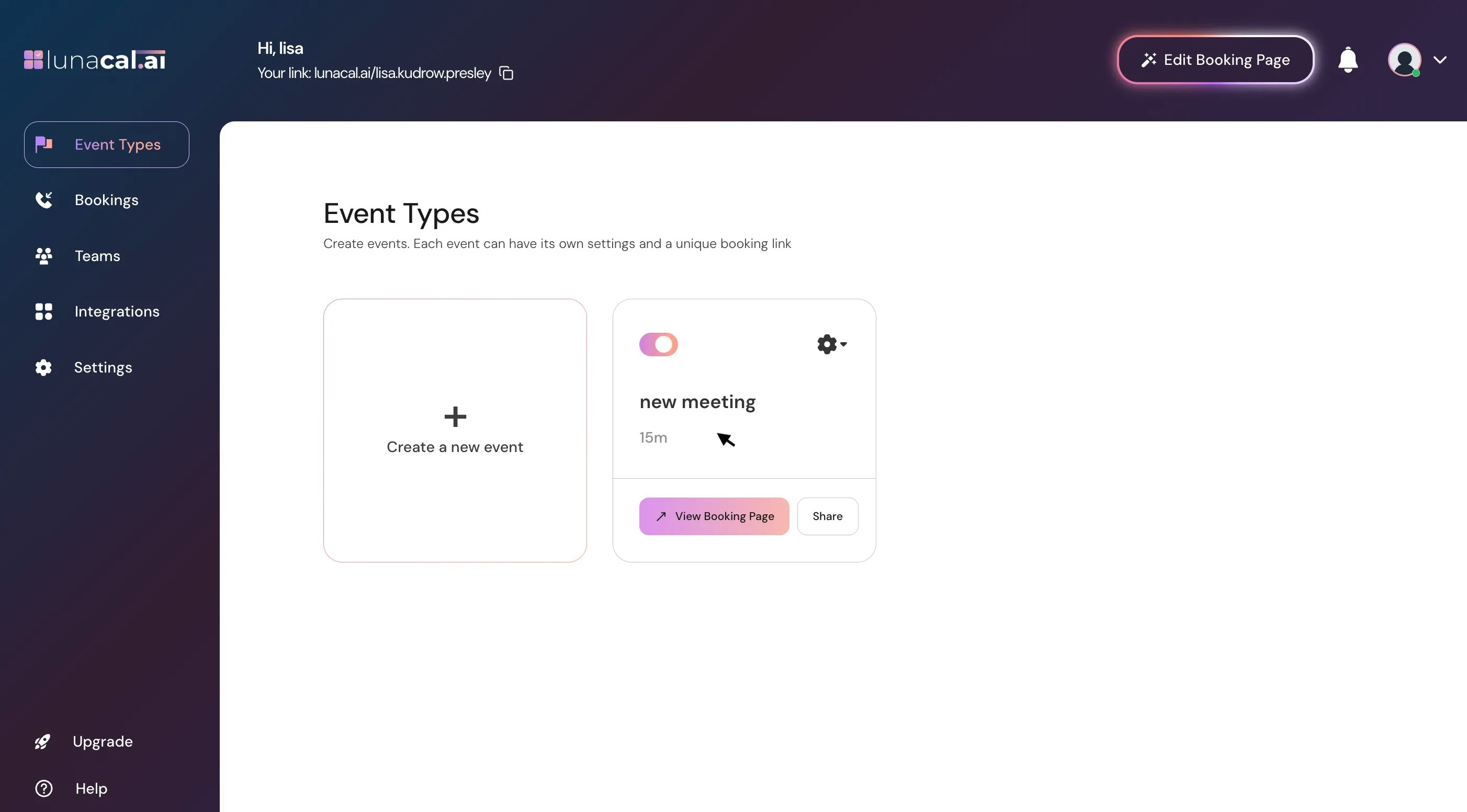 After creating an event type, you can make changes at any time using the Edit option available on when you click on gear icon on dashboard. If an event type is no longer needed, you can remove it using the Delete option. Deleting an event type immediately removes it and its booking page link, so ensure it is no longer in use before deleting.