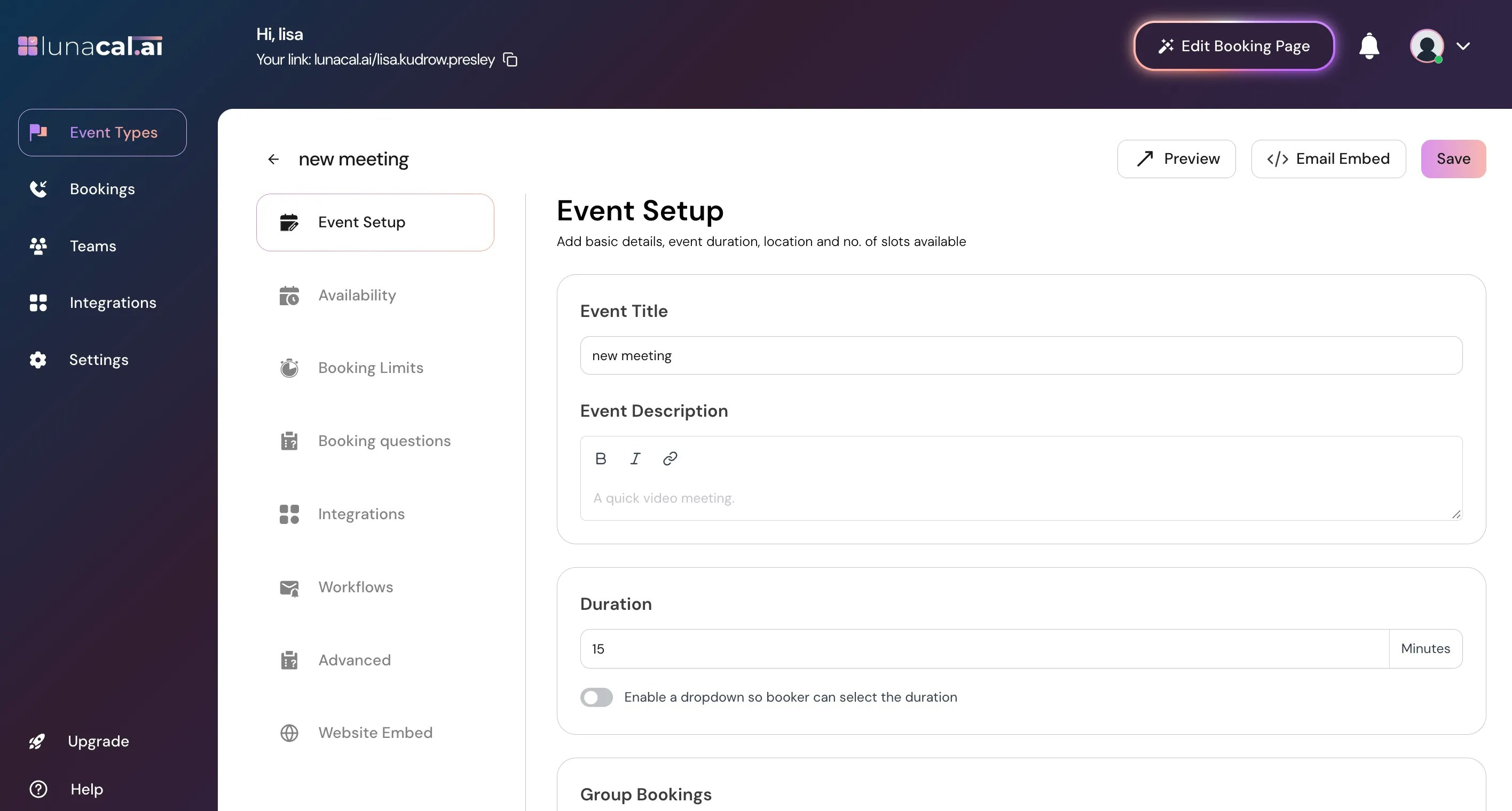 In this view, you’ll see options to further customize your event details and settings, fill the basic details such as the title, description, duration. To help attendees clearly understand your event, use concise and descriptive titles.The event description should briefly communicate the purpose of the meeting, any expectations, and important details attendees need to know. (Description is Optional)