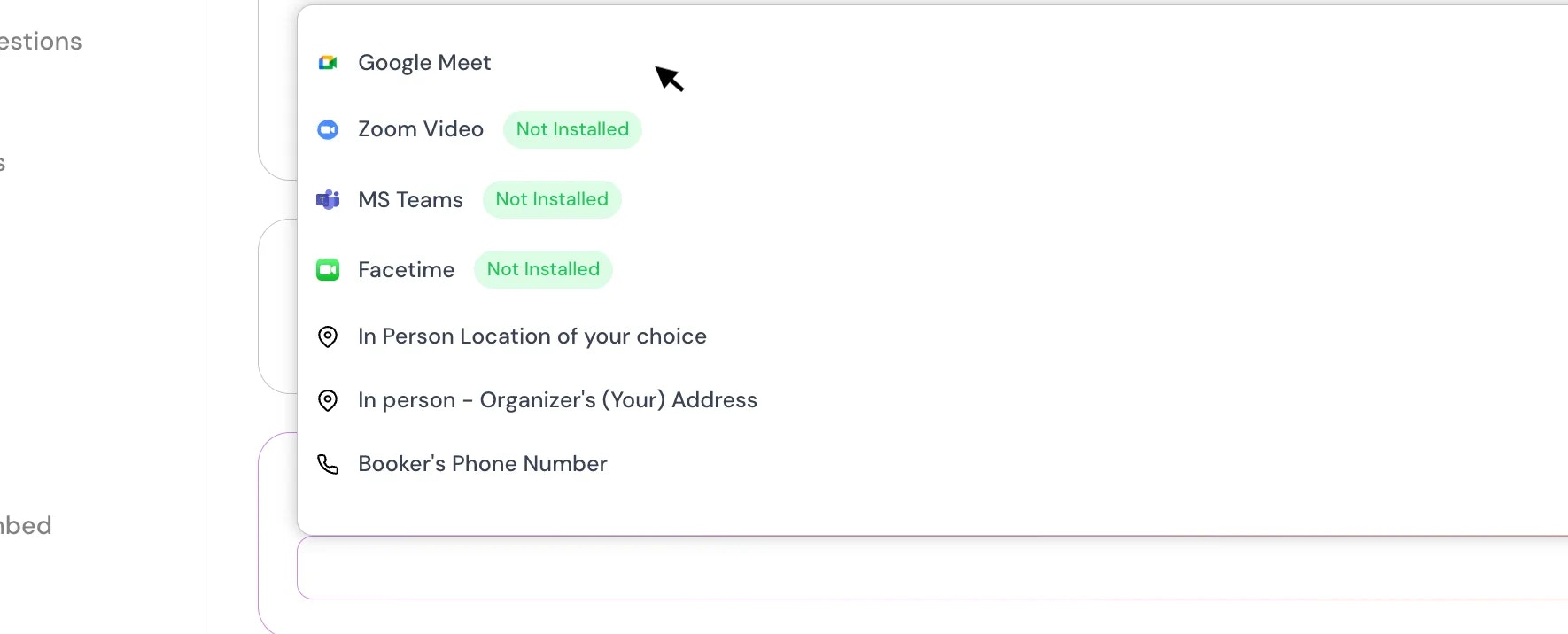 You can choose location from the dropdown, such as, In-Person (Location of your choice), In-Person (Organizer Adress), Link Meeting, Attendee phone number, organizer phone number, and your confrencing apps such as ( Google Meet, MS-Teams, Facetime & Zoom).