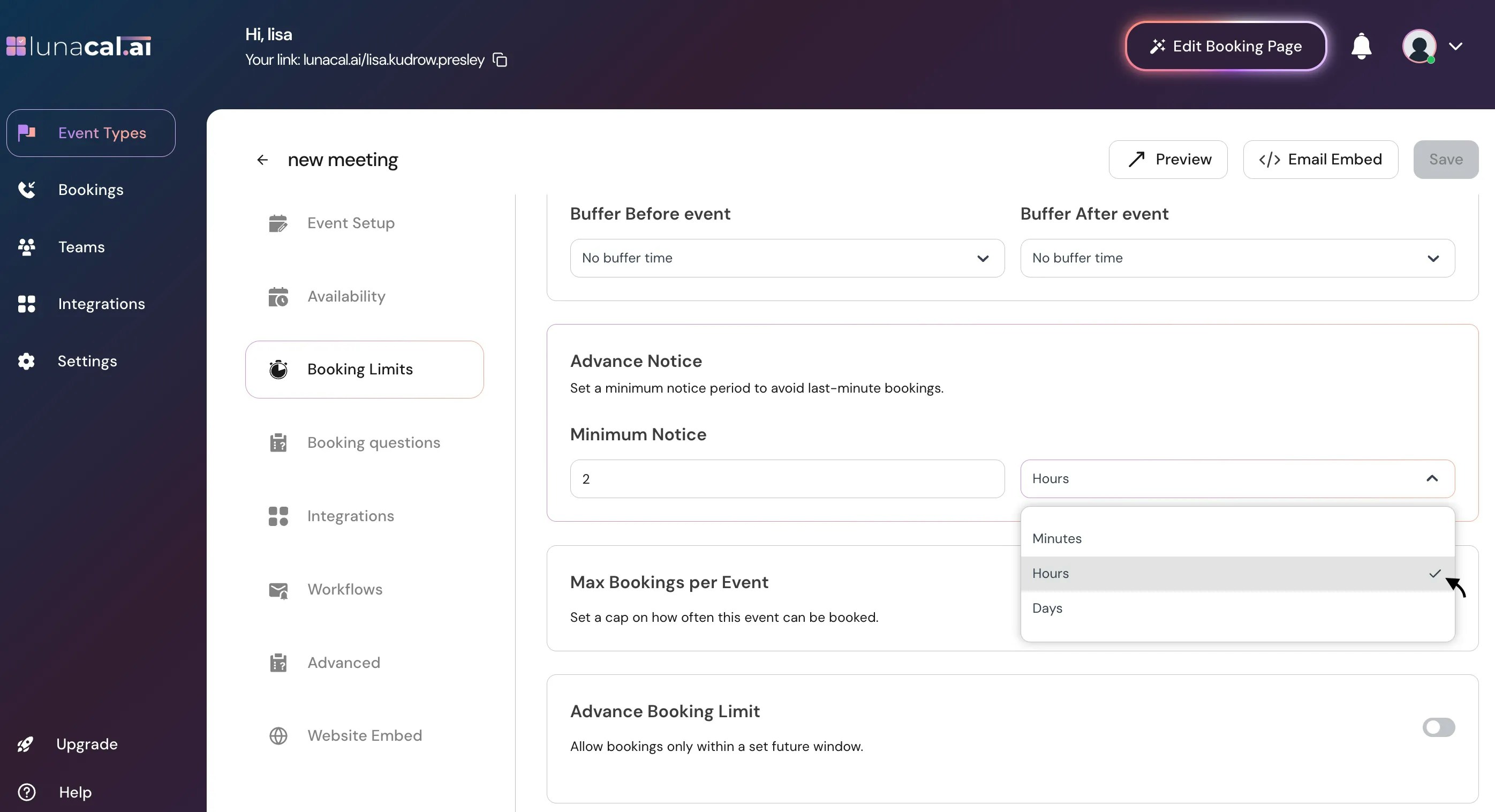 In the Advance Notice section, define the minimum notice lead time before someone can book you. This prevents last-minute bookings (for example, within the next hour). You can set the notice in minutes, hours, or days.Example: Require at least 2 hours’ notice so you’re not surprised by immediate bookings.