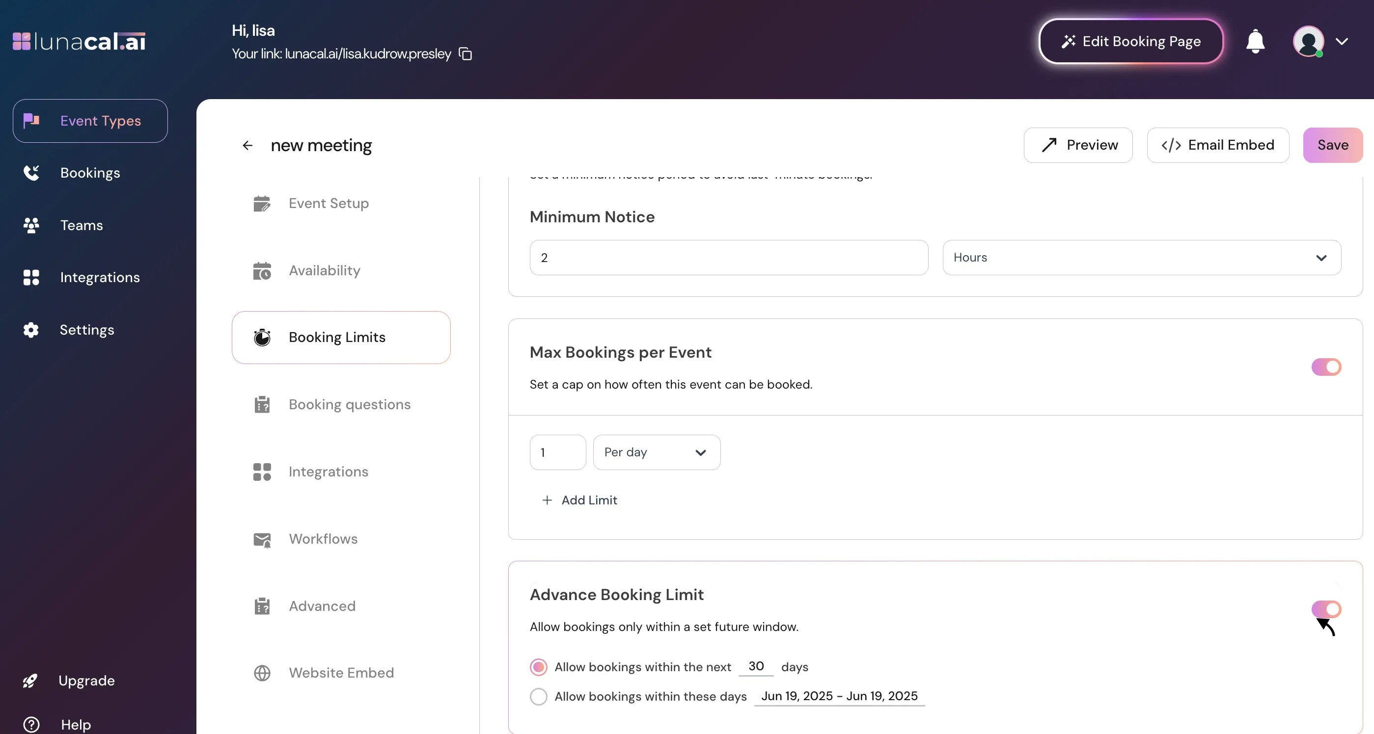 Set the “Advance Booking Limit” to control how far into the future people can see and book. You can allow booking within 30 days or specify the exact days you want open.Example: Show only the next 30 days so your calendar doesn’t get locked months ahead. 💡
