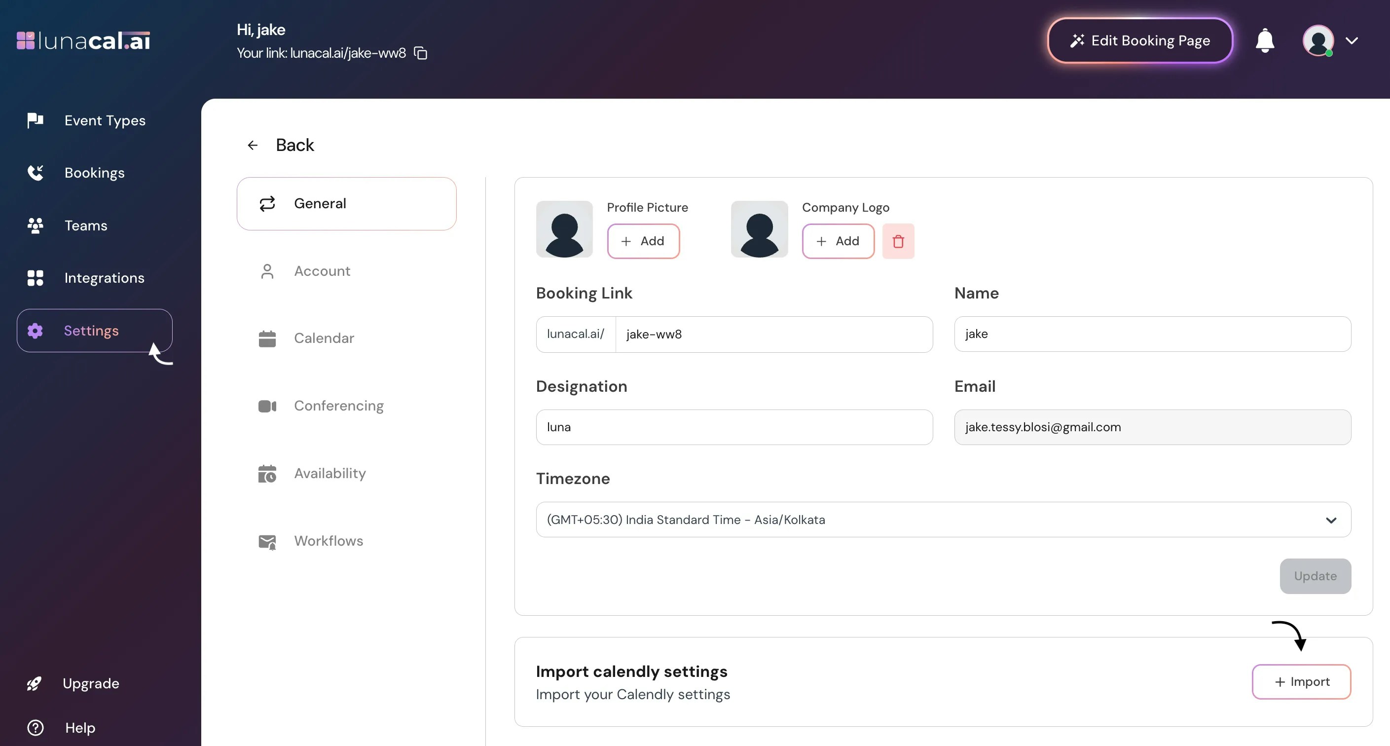 Navigate to the “settings” section. In the “import calendly settings” feature, click “Import” to initiate the process.Example: Testing first? Create a temporary team in Lunacal and run “Import” there so you can review event types safely before using them live.