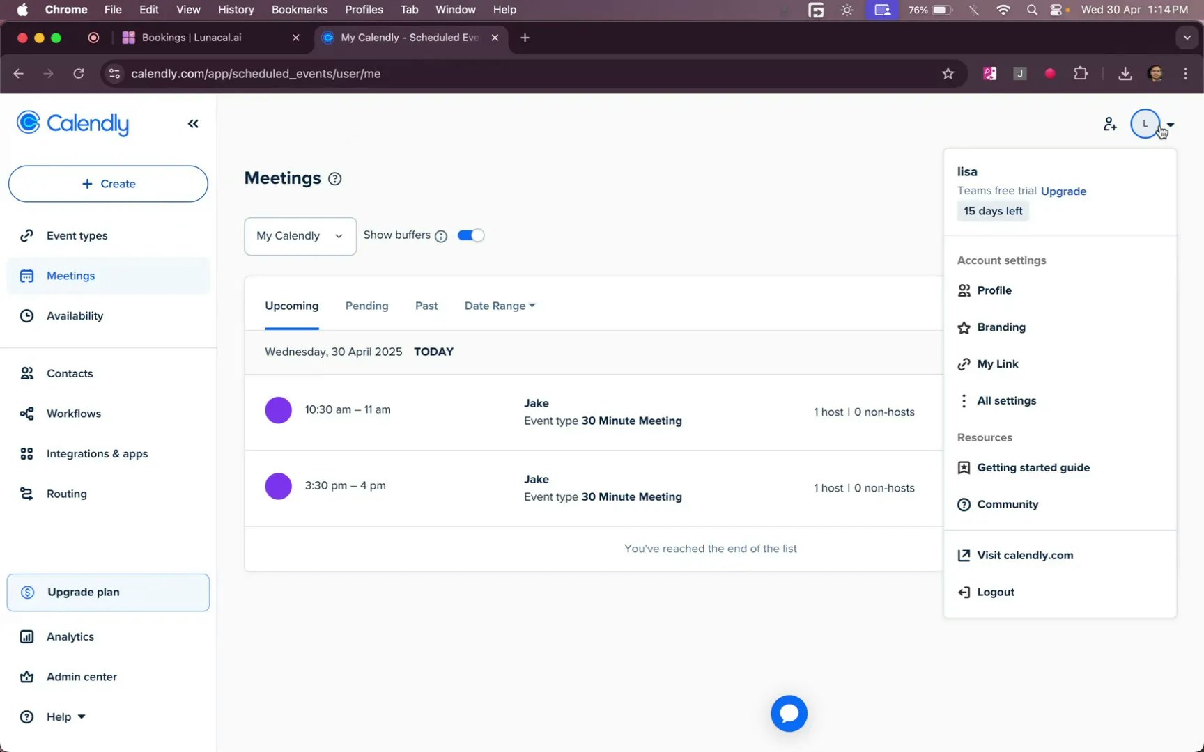 Once the import is complete, you’ll see your Calendly event types and bookings appear in Lunacal.Example: After import, open a migrated event type and check its duration, buffers, and location details match your original setup. If needed, adjust and save