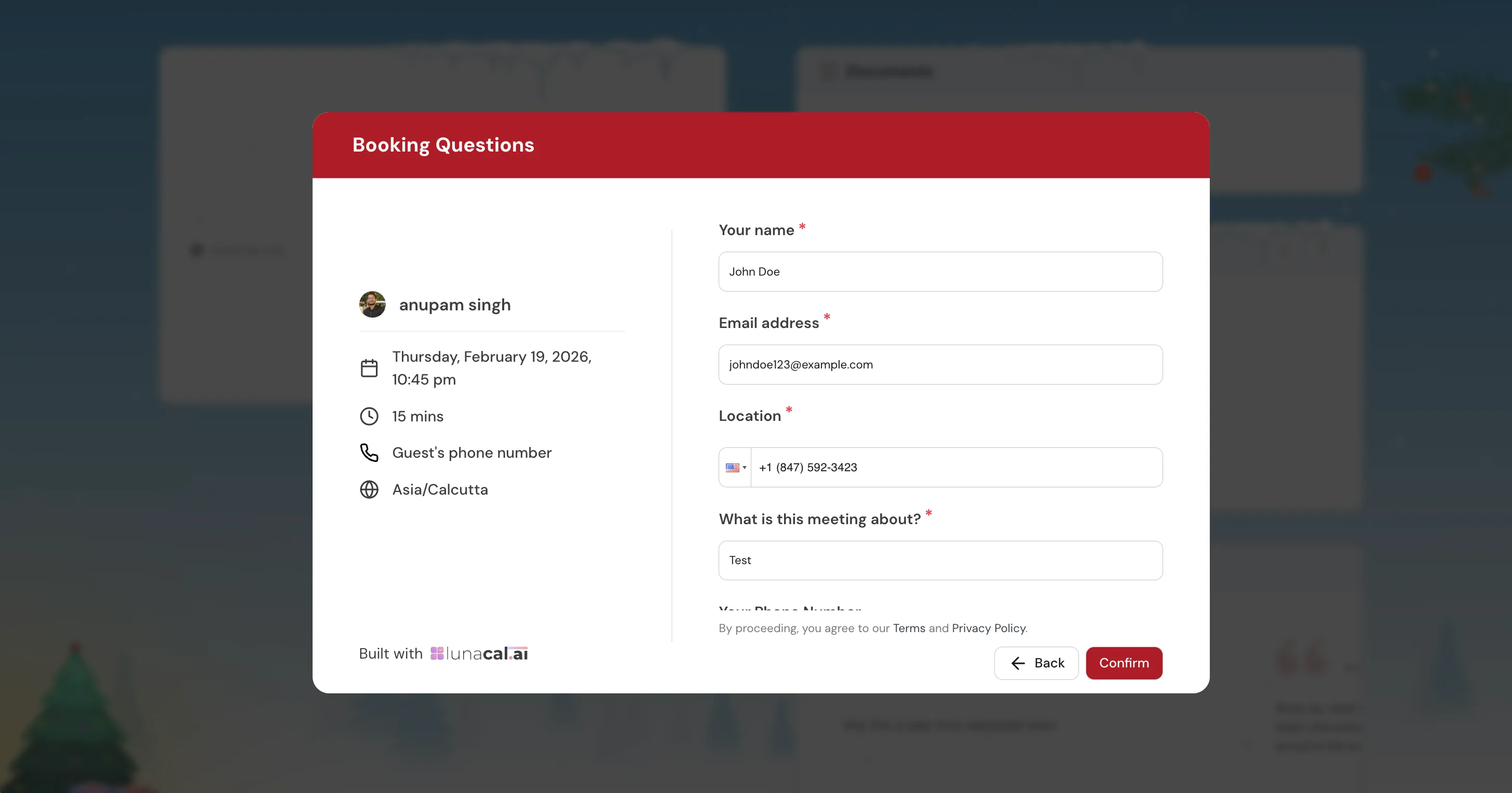 lunacal supports prefilling booking fields by passing values either:- via URL query parameters