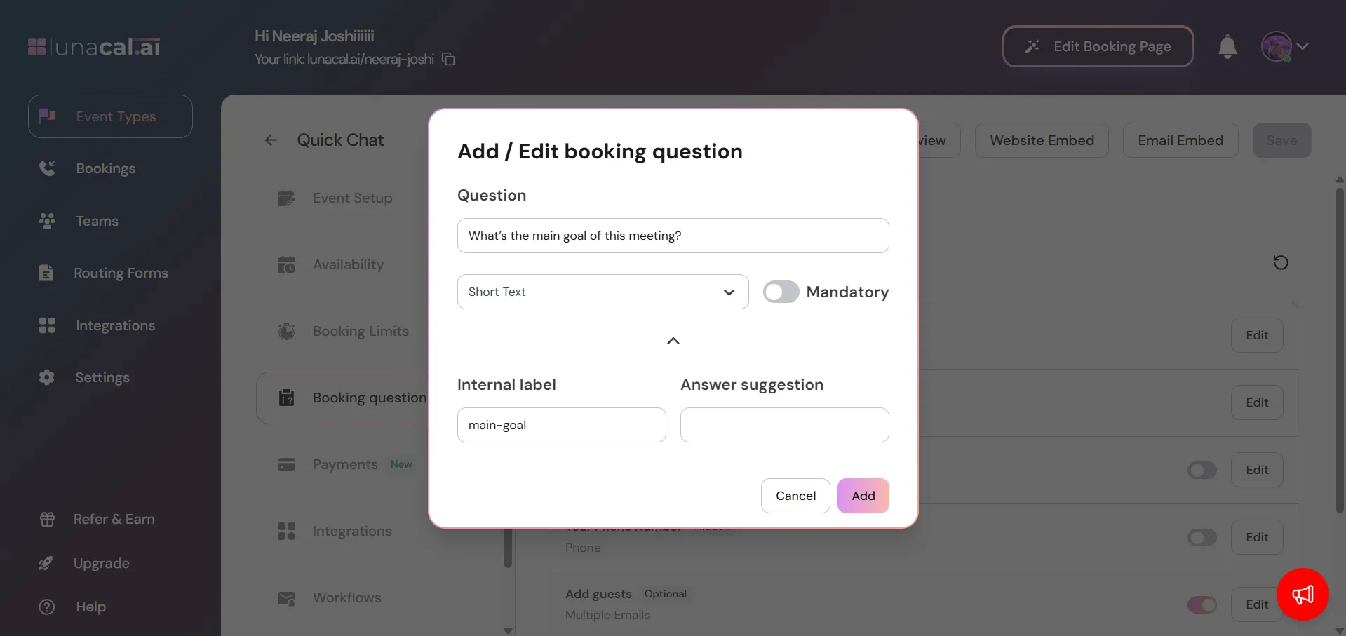 You can pre-fill all the booking questions on the booking form by using their corresponding internal label that you can see in booking question tab. e.g. for the following question (shown in screenshot below), the question would show up as ”What’s the main goal of this meeting?” and its internal label is ”main-goal”. So, we would use “main-goal” as query param name to prefill the field.
