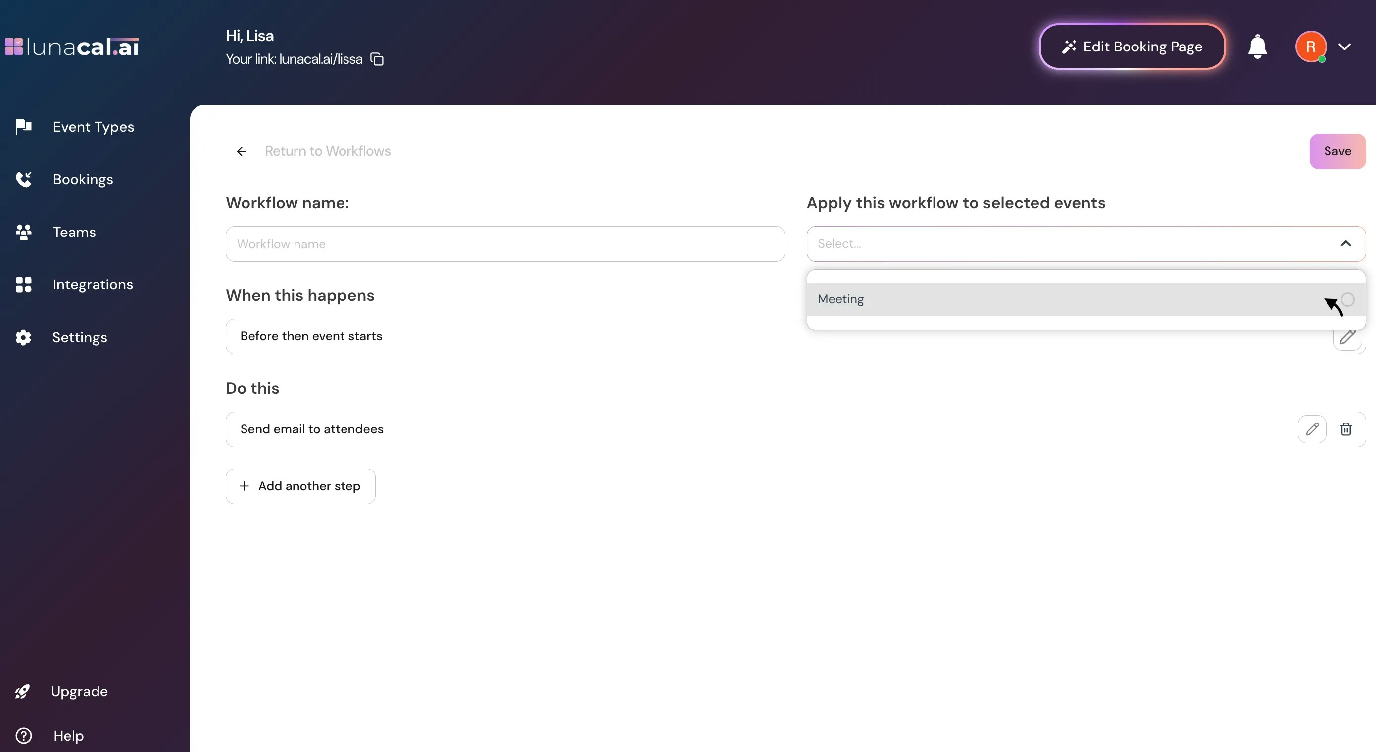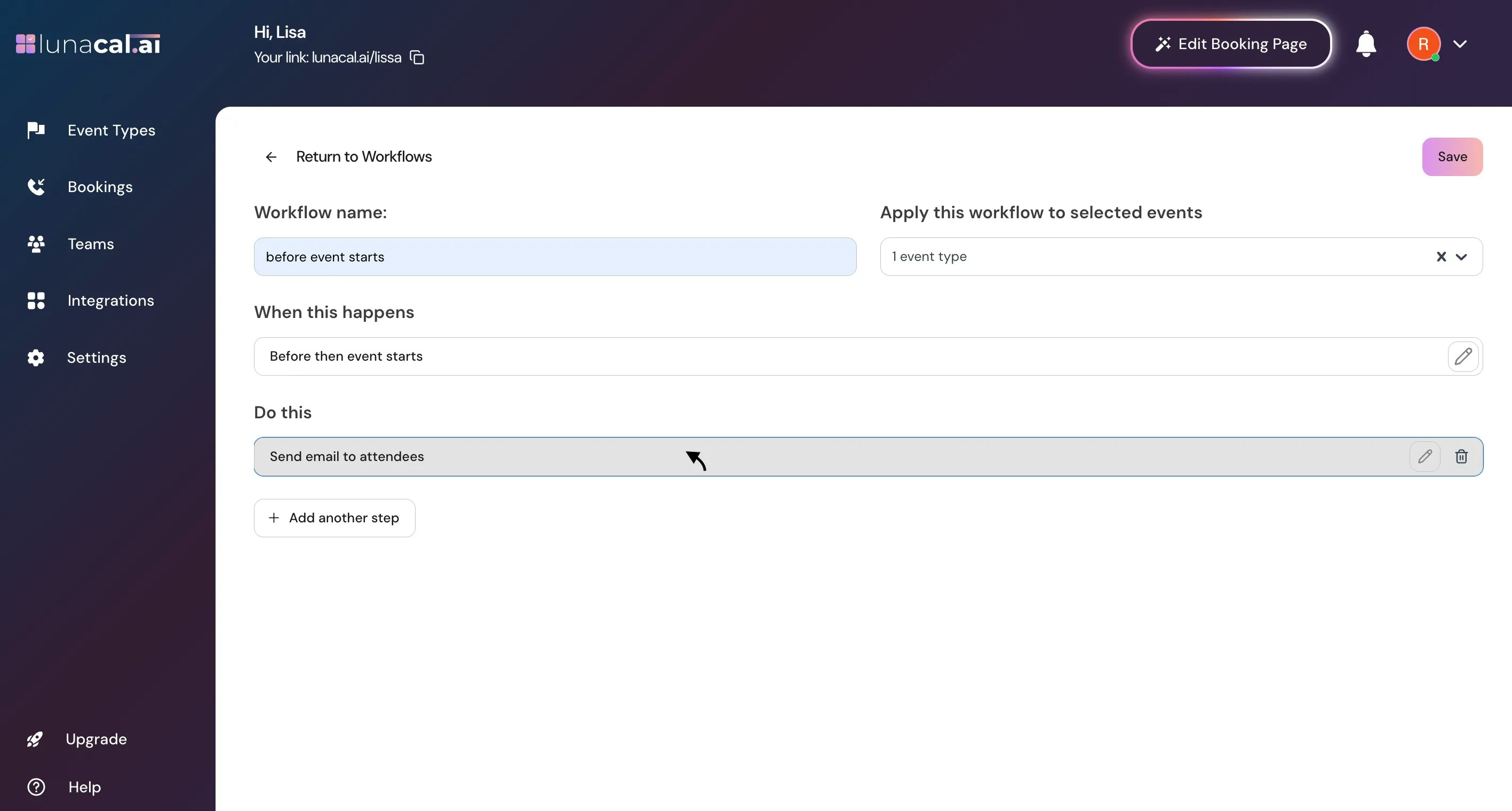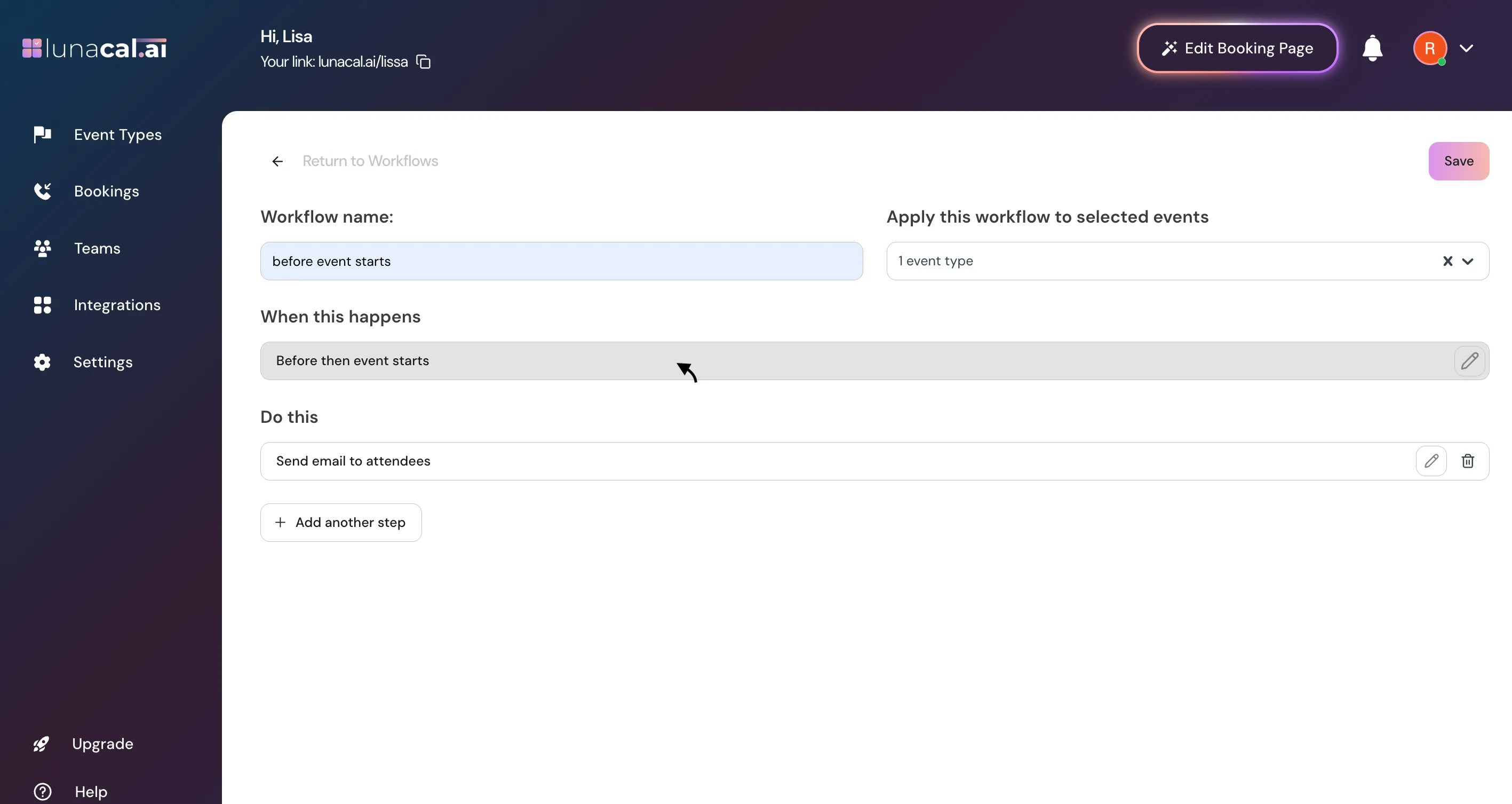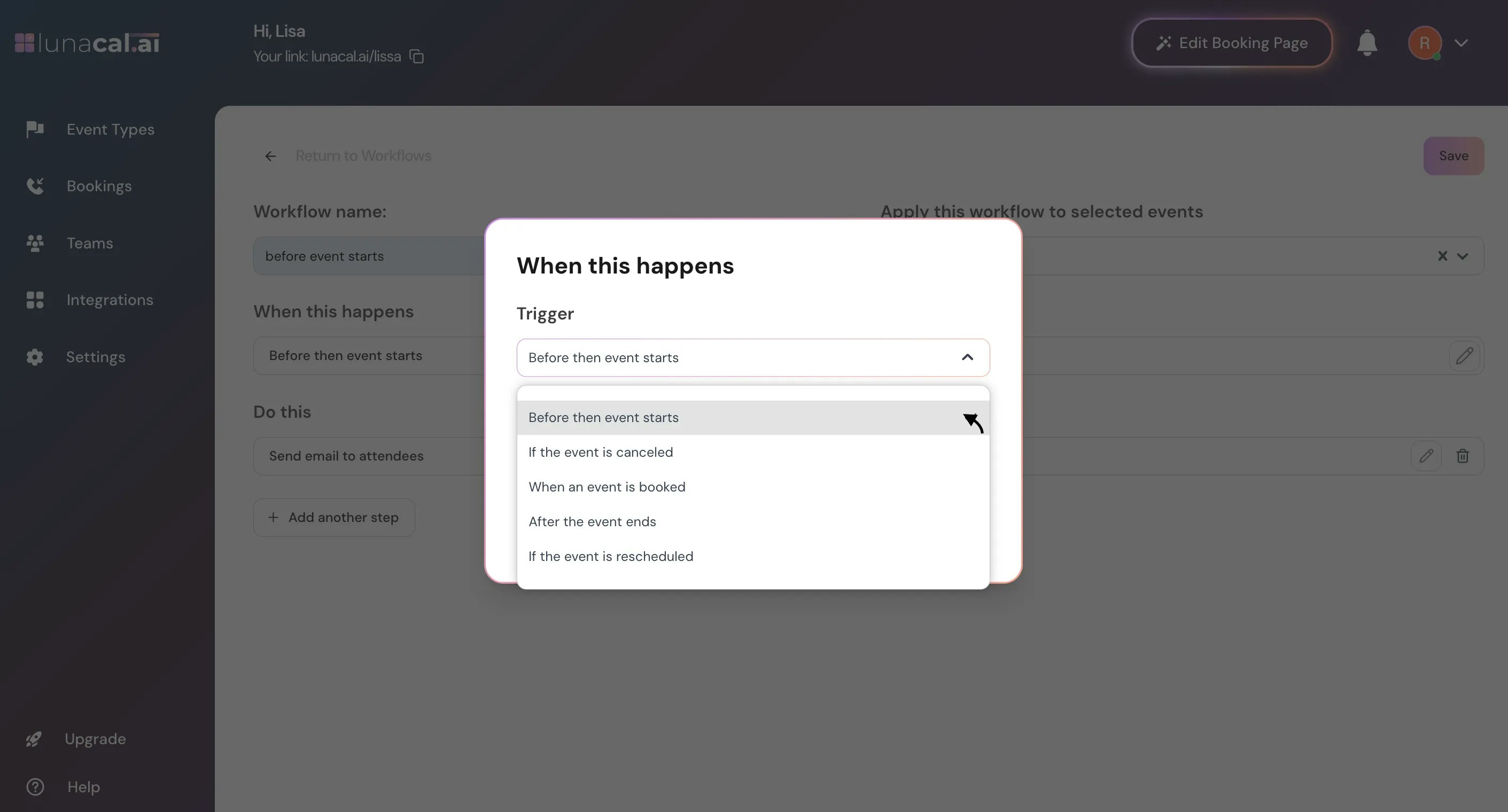 Pick a trigger: “Before an event starts”, “When event is canceled”, “When new event is booked”, “After event ends”, or “When event is rescheduled”.Example: Send a reminder “Before an event starts” so attendees don’t miss the call.