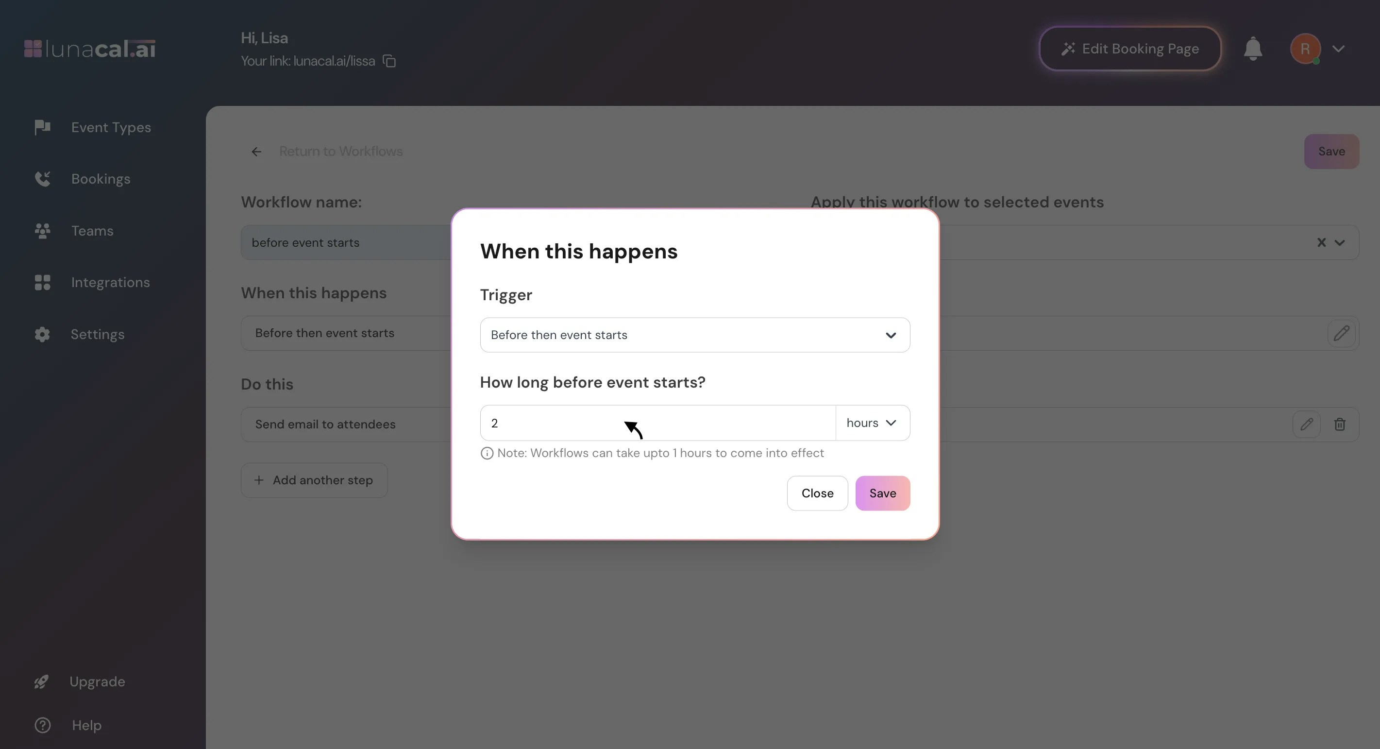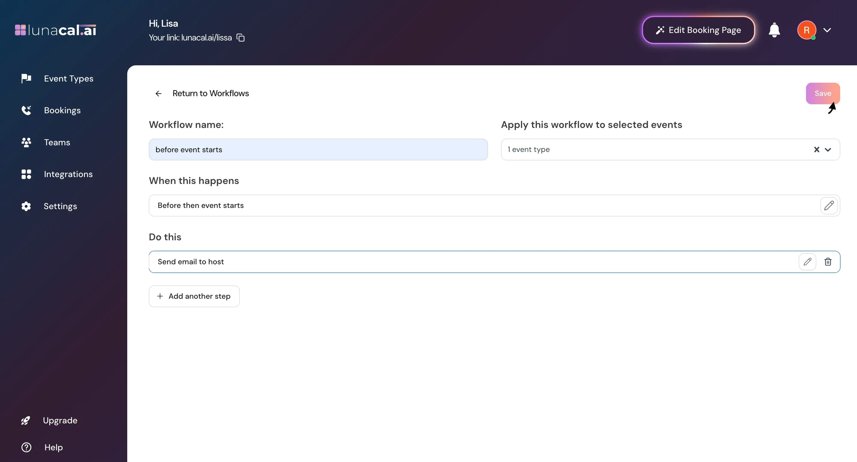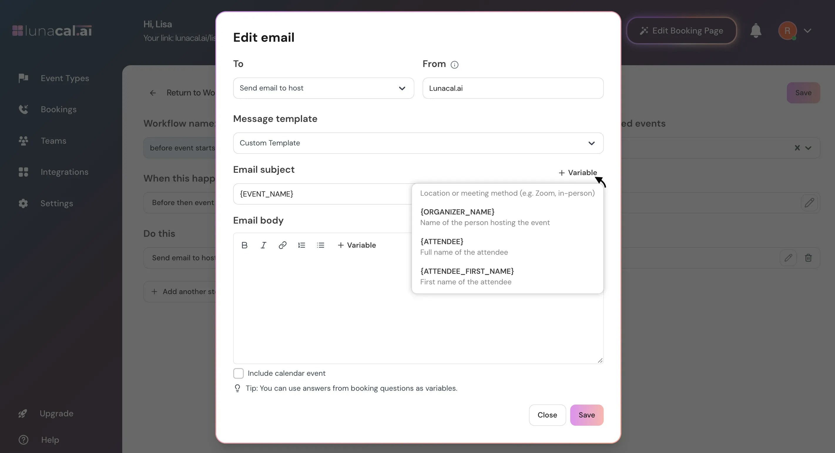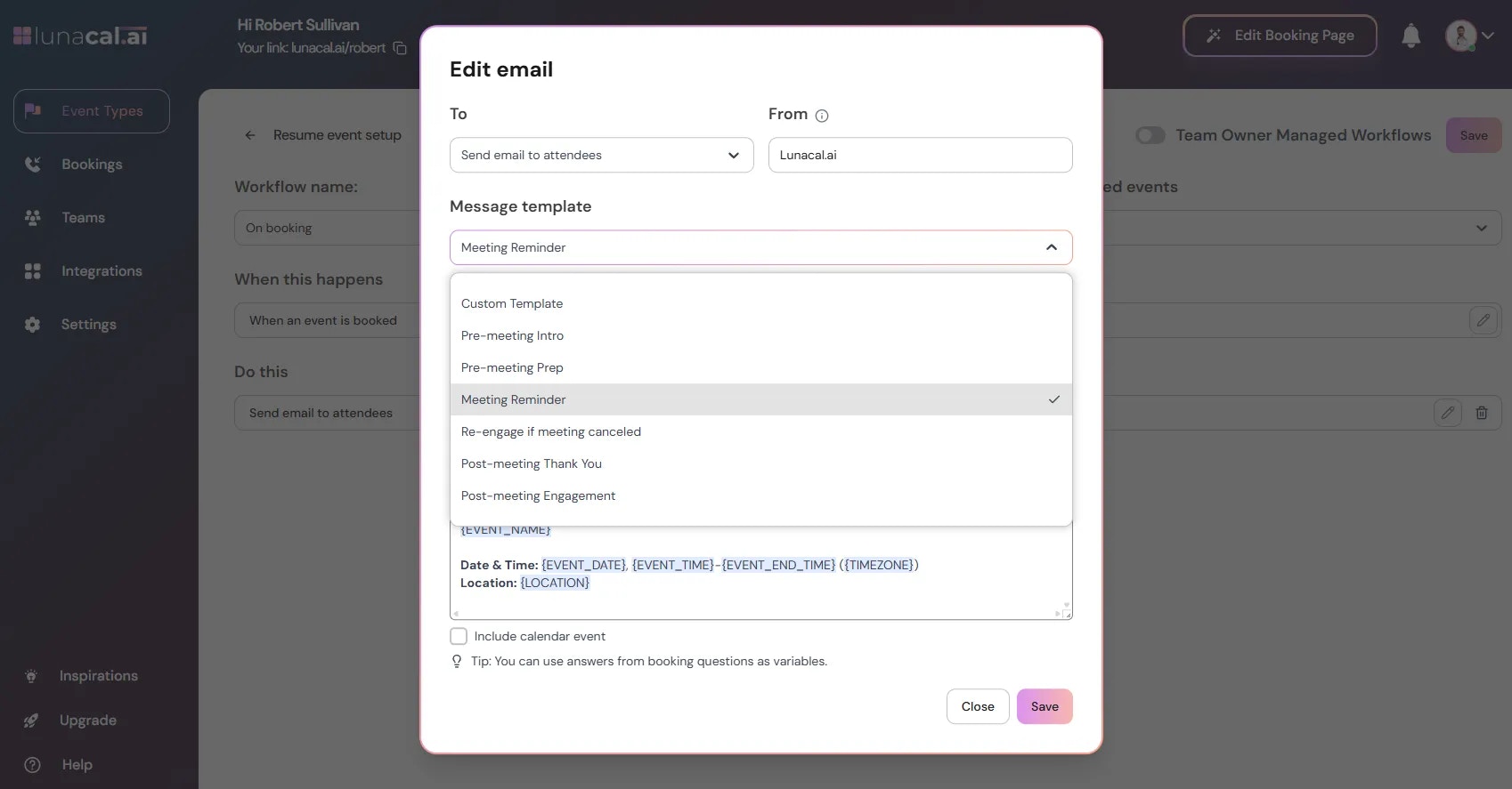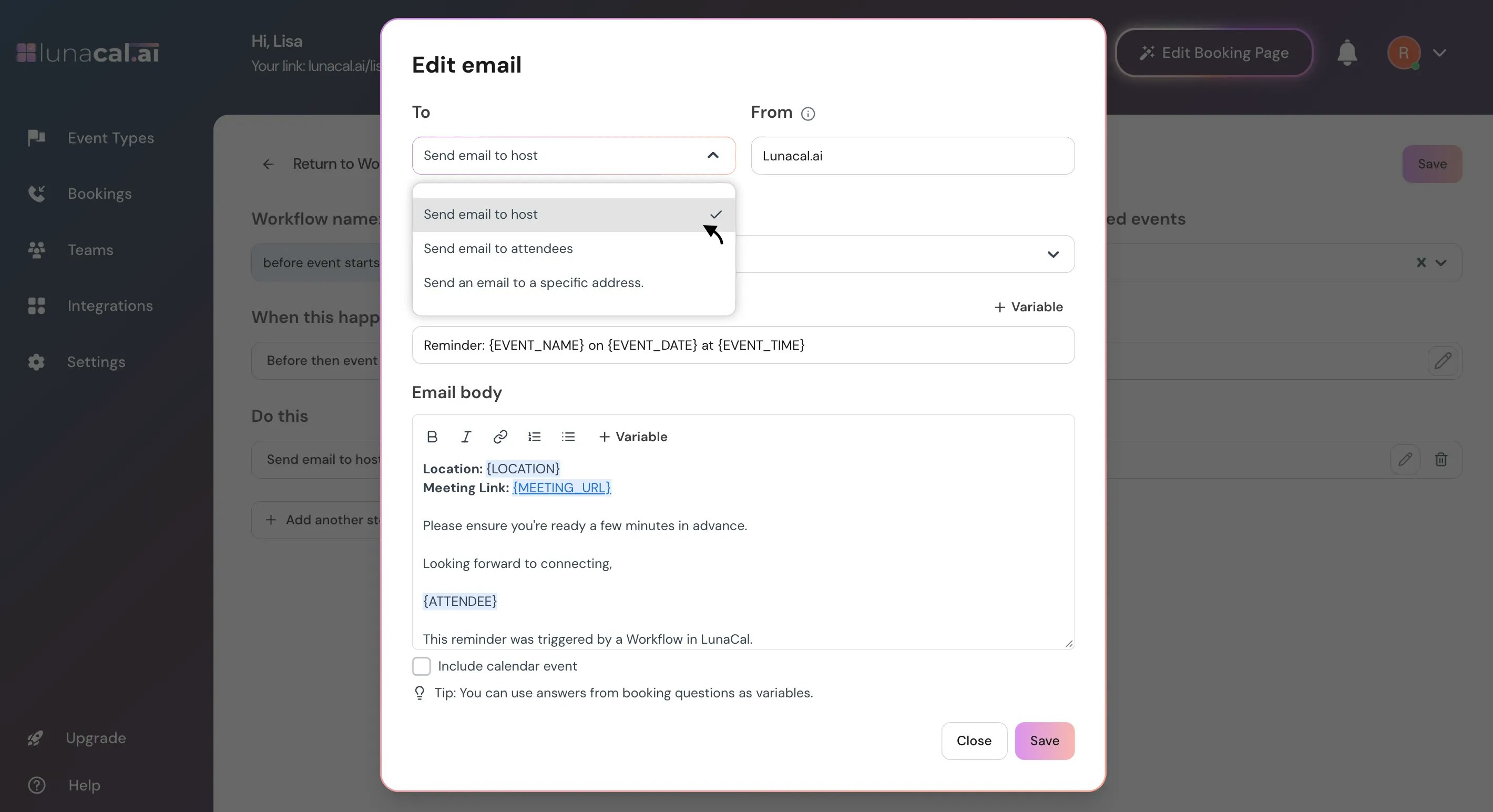 Pick a trigger: “Before an event starts”, “When event is canceled”, “When new event is booked”, “After event ends”, or “When event is rescheduled”.Example: Send a reminder “Before an event starts” so attendees don’t miss the call.